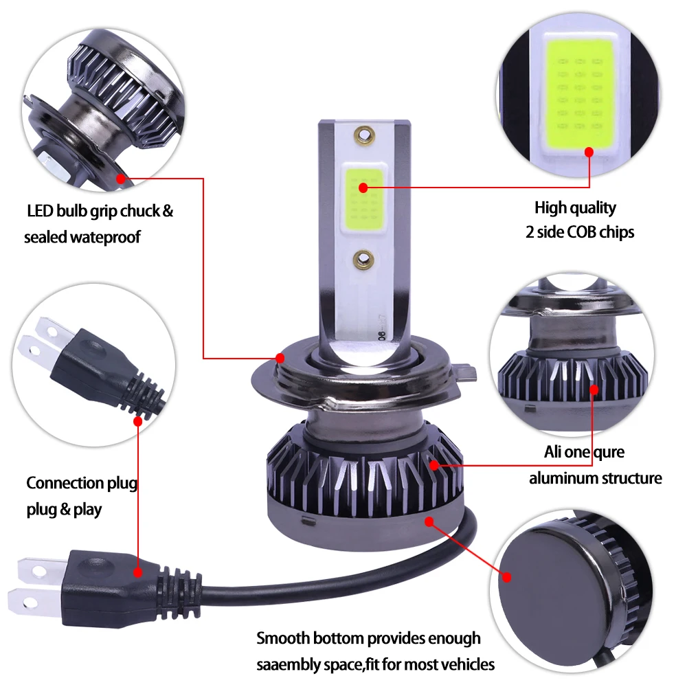 Примечание цвет:Только H4 имеет два цвета все в одном 3000K/6500K (Ближний свет 3000K золотой цвет, дальний свет 6500K белый цвет).6500K/8000K (Ближний свет 8000K Голубой цвет, дальний свет 6500K белый цвет) Особенности:Мощность: 36 Вт/комплектСветовой поток: 8000лм/комплектРабочее напряжение: 9-32 В постоянного тока (подходит для транспортных средств 12 В, 24 В)Цветовая температура: 3000K 8000K 6000KIP65 Номинальное уплотнение воды и пыли, угол луча 360 градусовМатериал: авиационный 6063 алюминиевый профильРабочая температура: -40-80 градусов ЦельсияСрок службы более 300 часовИспользование: головной светильник, противотуманный светильник Канал рассеивания тепла1. Все-в-одном алюминиевый профиль в качестве теплопроводящей системы, 360 градусов тепло излучение Посылка включает в себя:2x светодиодный лампы для фар