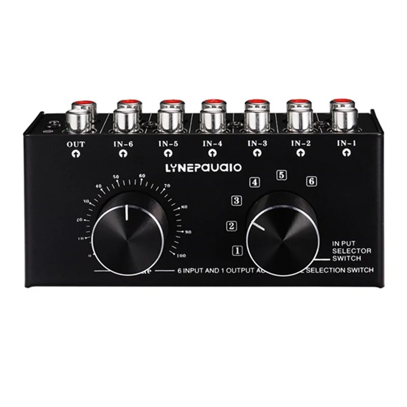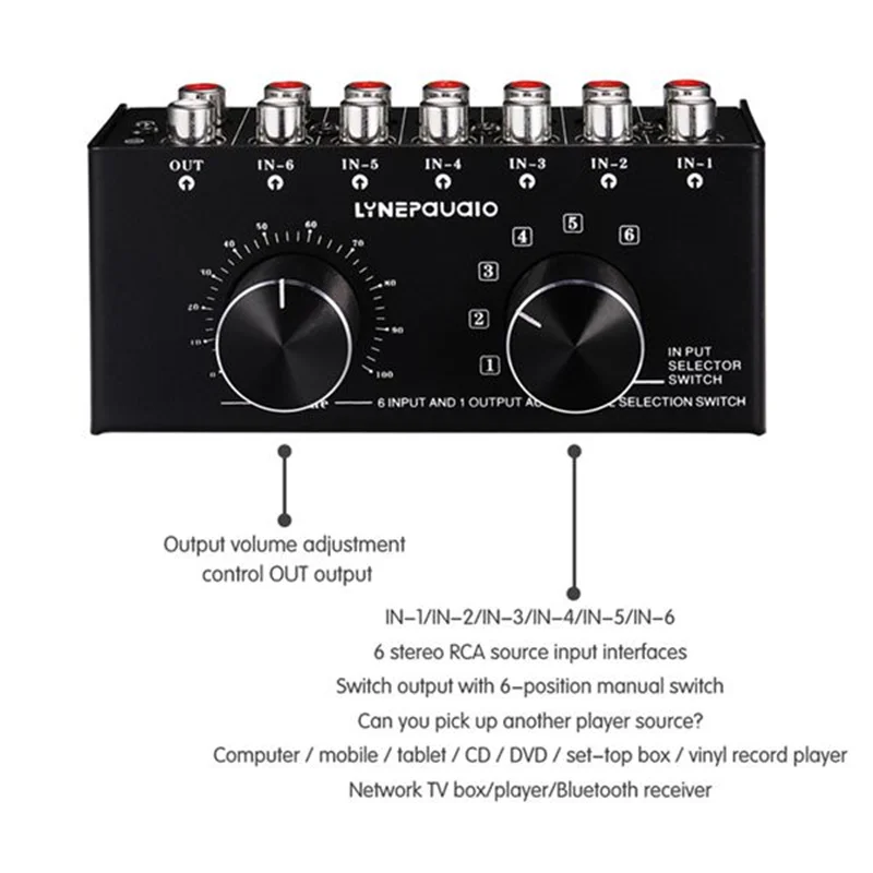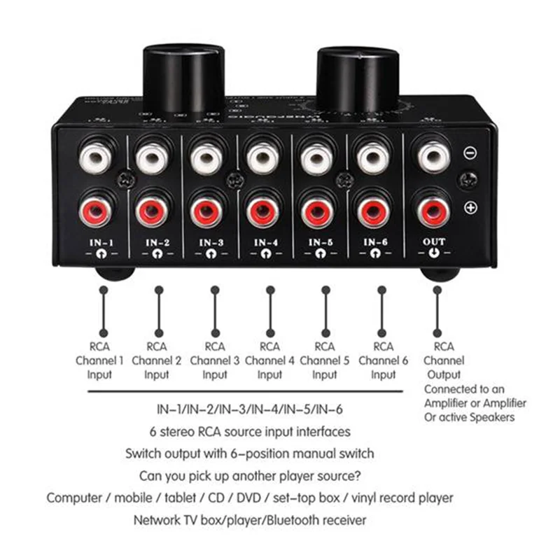 Переключатель 6 входов 1 выход, переключатель выбора источника, Переключатель входного сигнала RCA o с регулировкой громкости и Manu