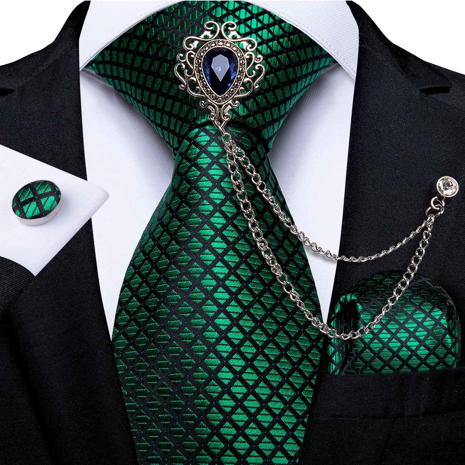 Новая модная Зеленая Мужская брошь галстук в клетку набор мужских шелковых галстуков Свадебная вечеринка галстук носовой платок запонки набор роскошный галстук DiBanGu