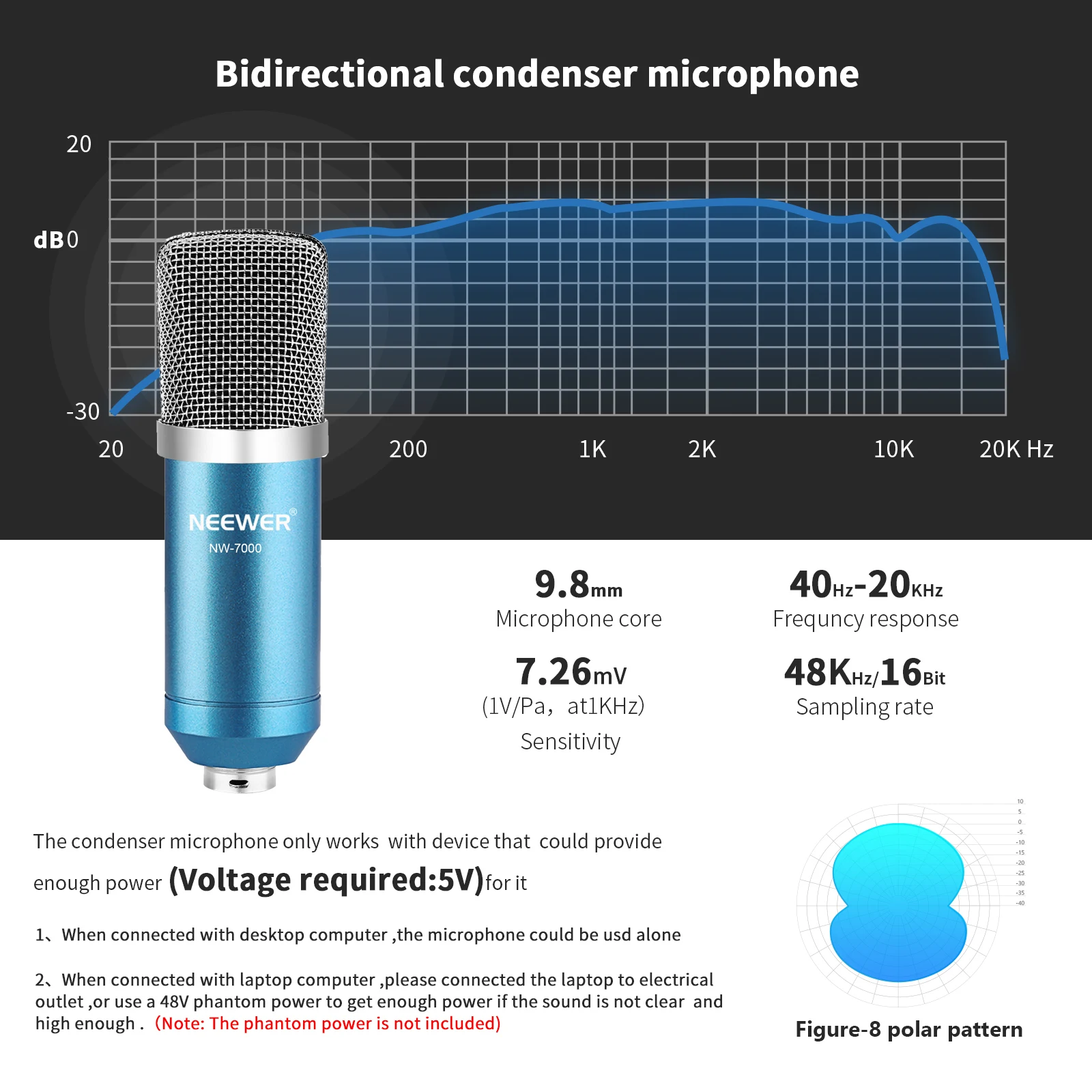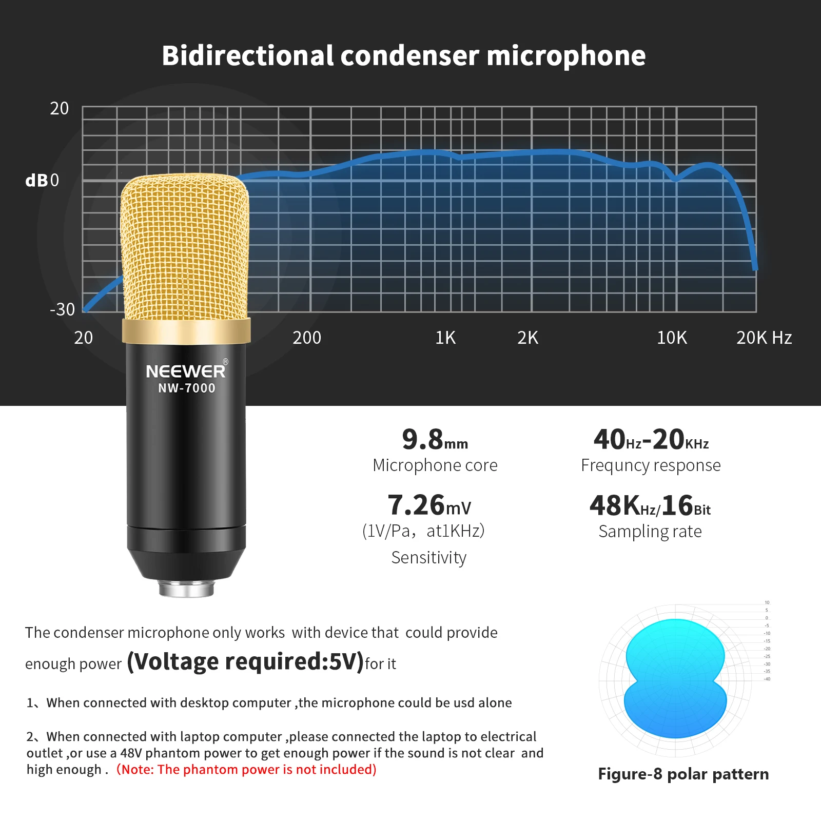 2. NW-7000 usb-конденсаторный микрофон работает только с устройством, которое может обеспечить достаточную мощность (требуемое напряжение: 5 В) для него; При подключении к компьютеру микрофон может использоваться отдельно; при подключении к ноутбуку Подключите ноутбук к электрической розетке, Или используйте фантомную мощность 48 В, чтобы получить достаточно мощности, если звук недостаточно четкий или достаточно высокий.