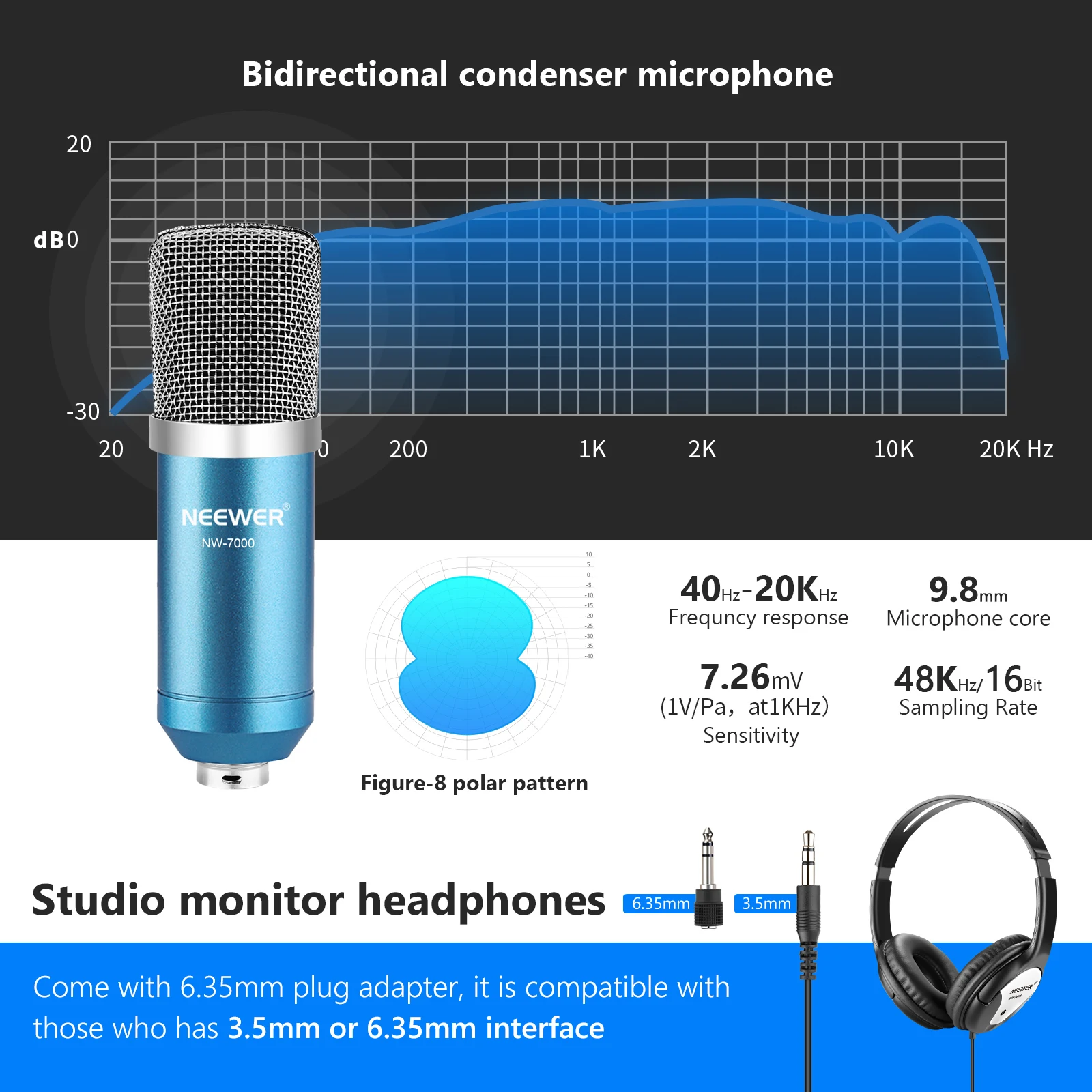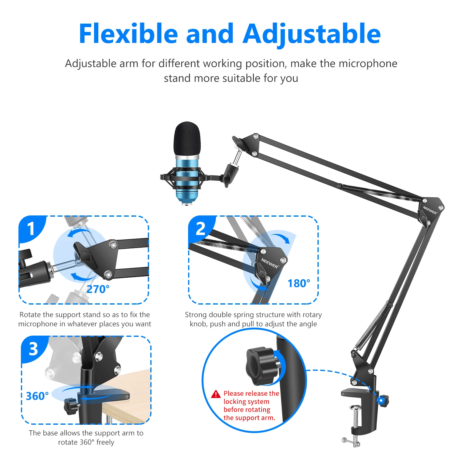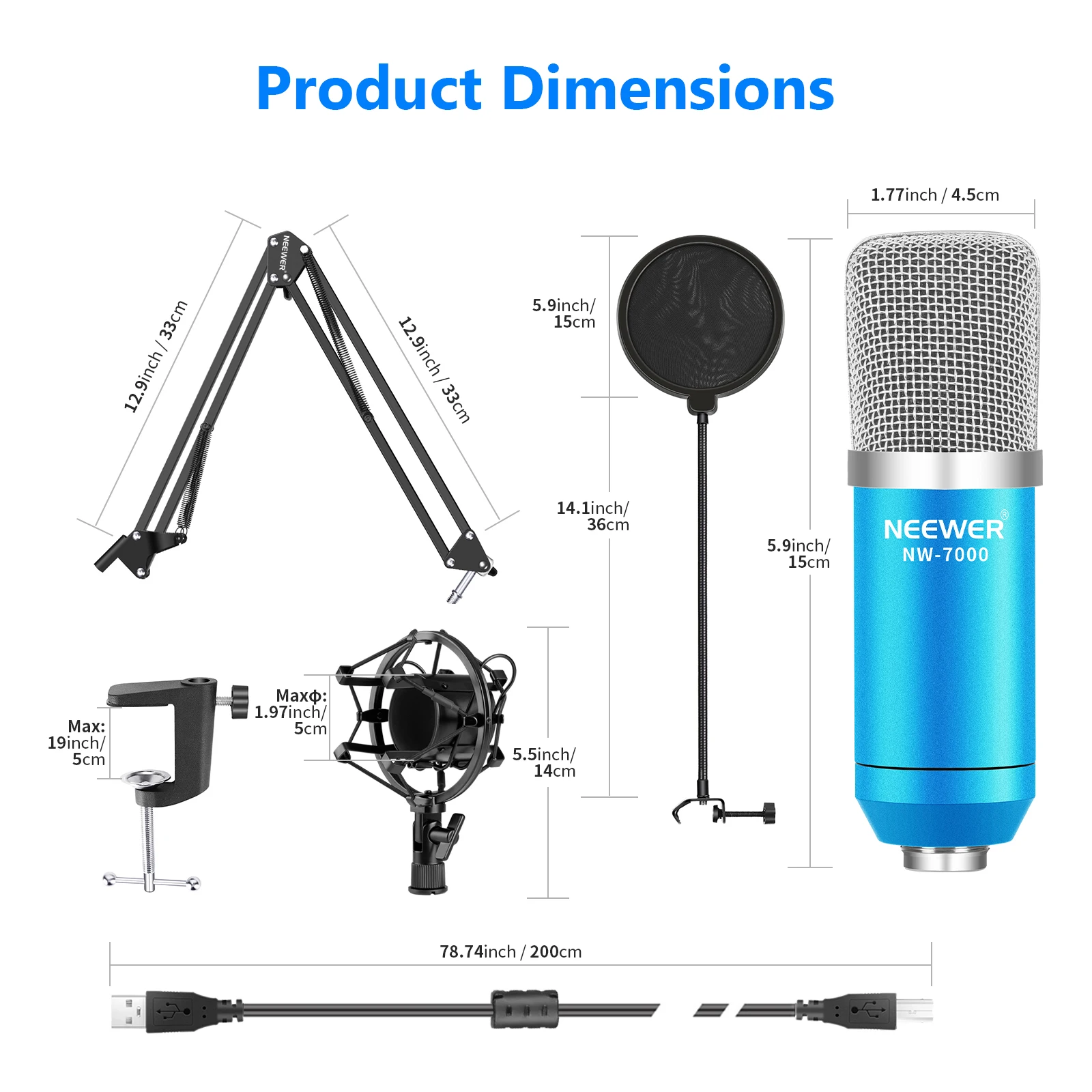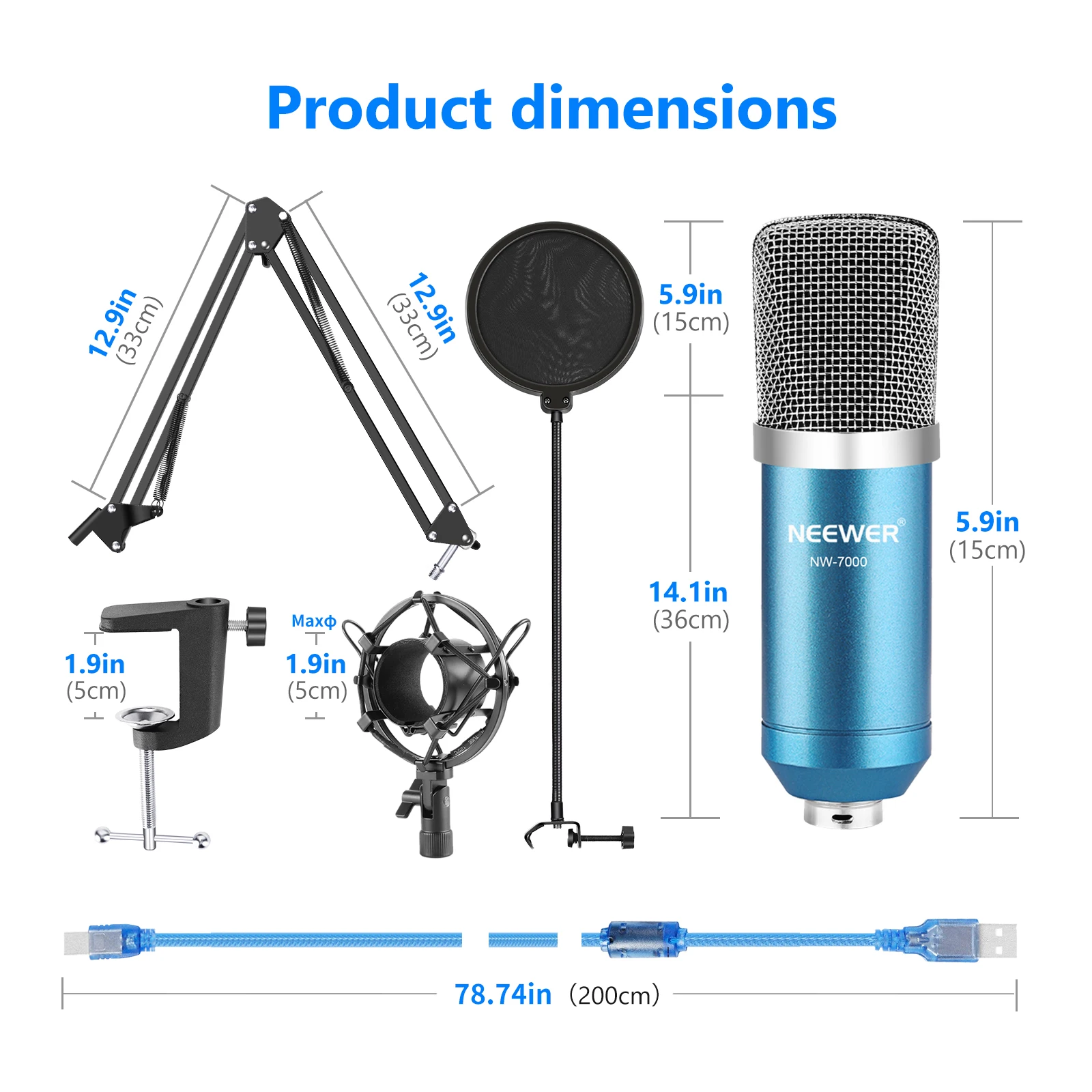 Neewer 7000 USB микрофон для Windows и Mac с подставкой, ударным креплением, поп-фильтром, набор для вещания и звукозаписи (черный/Синий серебристый)