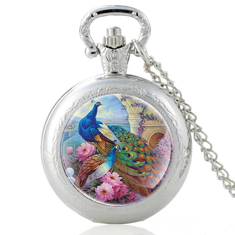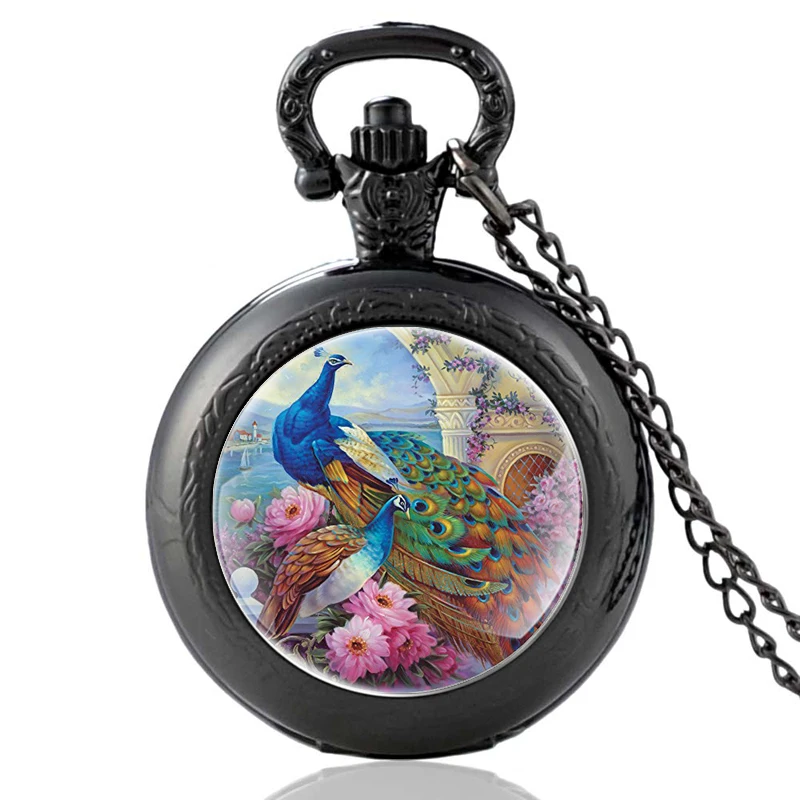 Элегантный дизайн павлина винтажные черные кварцевые карманные часы уникальный кулон часы для мужчин и женщин стекло купол ожерелье лучшие подарки