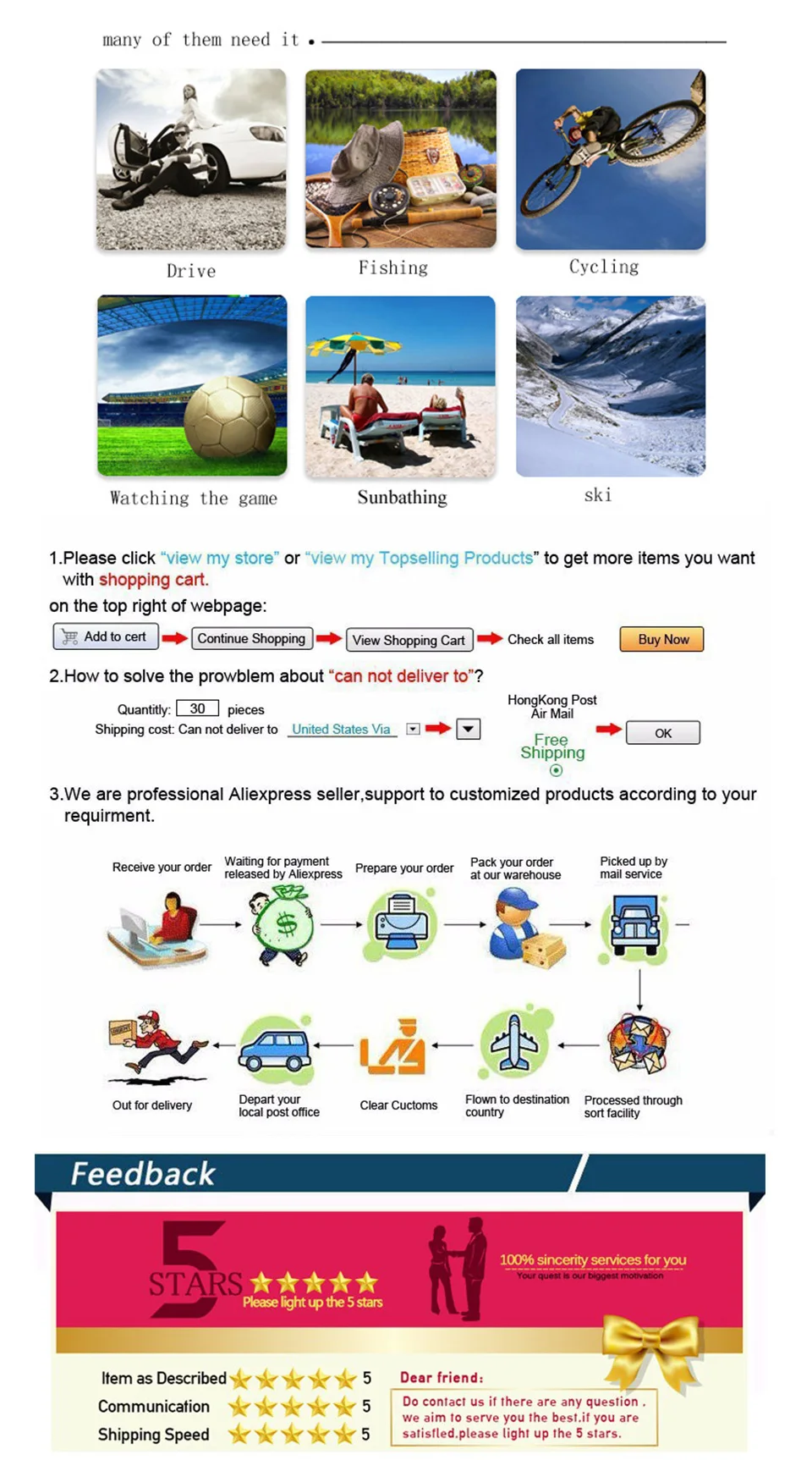 Гарантия и возврат: * 30 дней гарантии с даты отправки, пожалуйста, свяжитесь с нами по электронной почте, прежде чем вернуть бракованный товар. * Покупатель резонирует стоимость обратной доставки, возвращаемый товар должен включать оригинальную упаковку и аксессуары Услуги клиентов: * В ответ на ваш запрос мы возможное, чтобы вы поделились этим позитивным опытом отзывы по всем сделкам и положительную оценку в 5 звезд. Если по какой-либо причине вы не удовлетворены своей покупкой, пожалуйста, свяжитесь с нами, прежде чем оставить отзывы, и мы поможем решить проблему для вас. Отзывы: * Удовлетворенность клиентов очень важна для нас. Если вы удовлетворены заказанными товарами, пожалуйста, оставьте 5 звезд отзывы. Если вы не удовлетворены заказанными товарами, пожалуйста, свяжитесь с нами, прежде чем оставлять отзывы. Мы можем работать вместе, чтобы решить любую проблему. Спасибо всем, пусть сила будет с вами! Уход за стеклами: * Независимо от оправы очков или солнцезащитных очков, правая нога сначала получена, а затем левая нога получена во время хранения. Неправильный способ может привести к тому, что очки будут сбалансированы и перевернуты. * После снятия очков Положите зеркало в Чехол для очков, убедитесь, что в очках нет частиц, чехол не царапает зеркальную поверхность, или положите его в Чехол для очков, обернув его салфеткой для очков. * После длительного ношения очков, это может привести к дисбалансу или даже деформации, поэтому рекомендуется заботиться о очках как можно больше. * Очки не должны помещаться в условиях высокой температуры, влажности в течение длительного времени, например, под лобовым стеклом автомобиля, ванной, кухни, чтобы не ускорить старение очков. * Не трите объектив на объекте, чтобы избежать царапин.