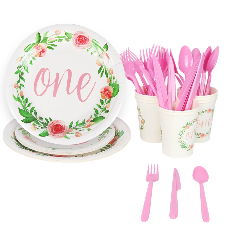 Детские бумажные стаканчики и тарелки с цветочным принтом для первого дня рождения