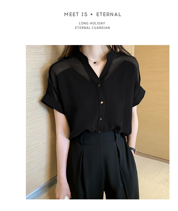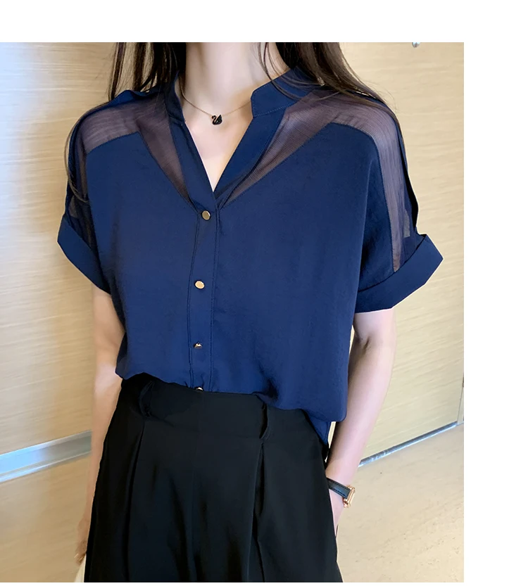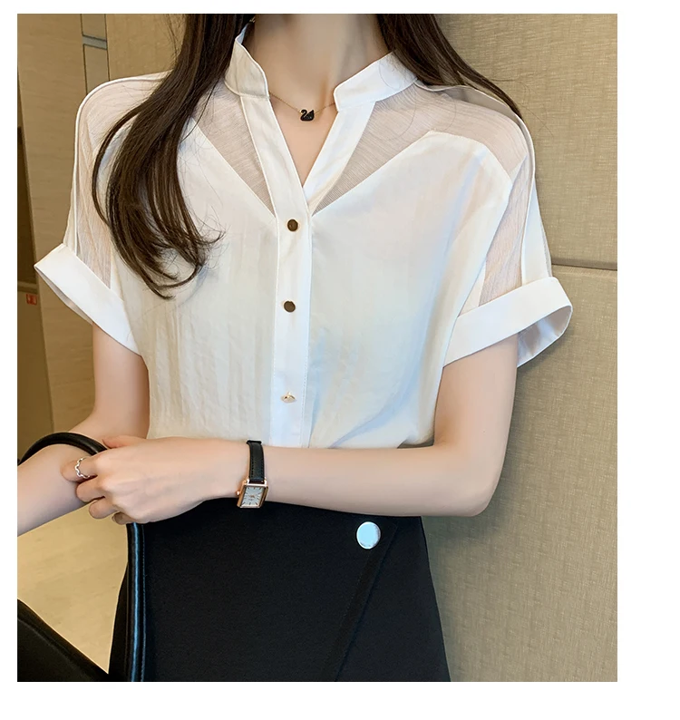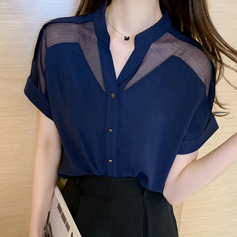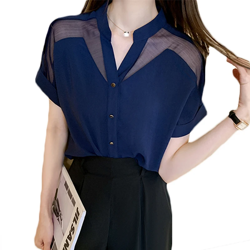 Новинка 2022, модная летняя кружевная рубашка с V-образным вырезом, женская шифоновая блузка, однотонные офисные Дамские топы с коротким рукавом, женские блузы, женская одежда