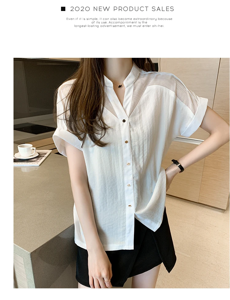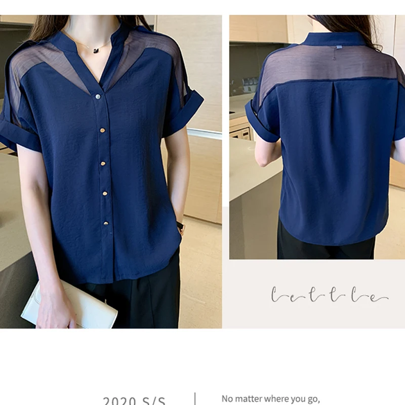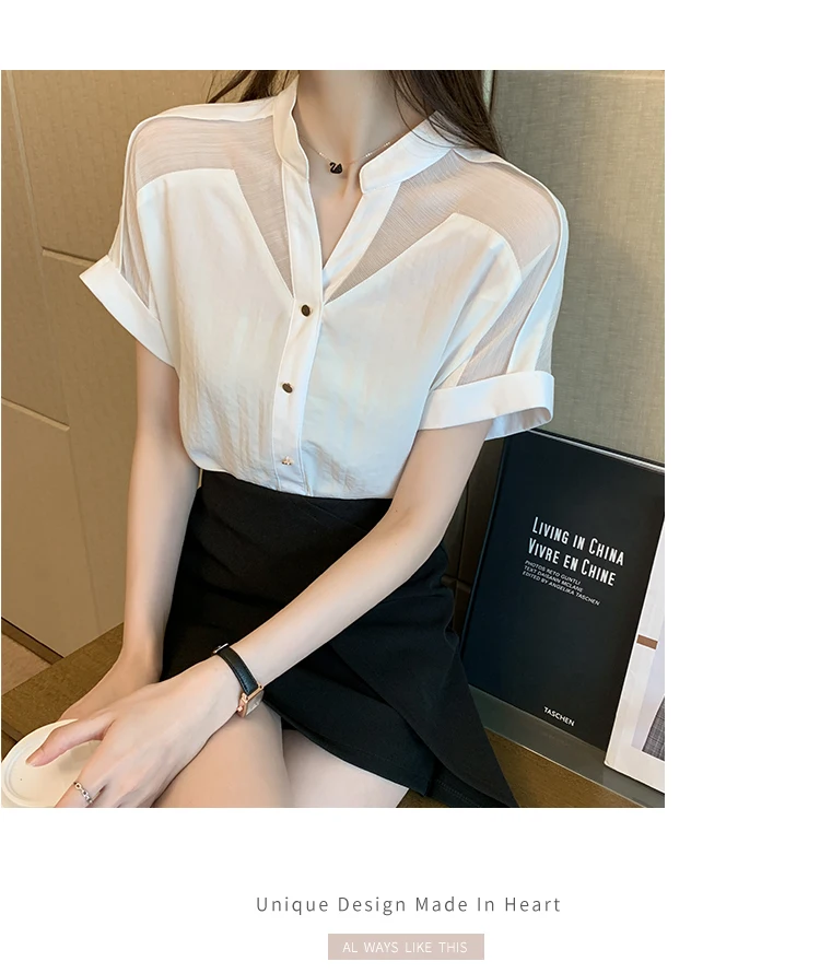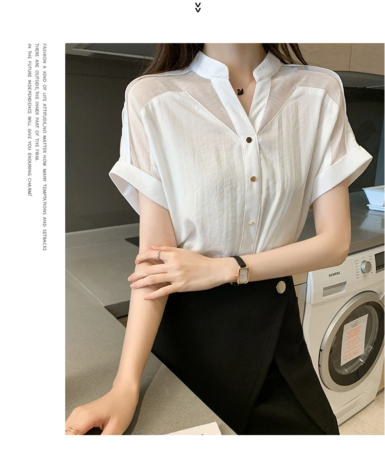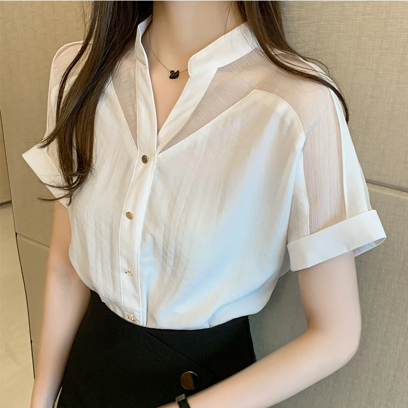 Новинка 2022, модная летняя кружевная рубашка с V-образным вырезом, женская шифоновая блузка, однотонные офисные Дамские топы с коротким рукавом, женские блузы, женская одежда