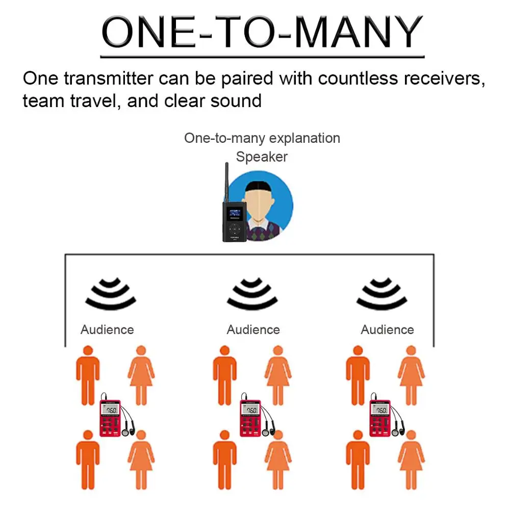 Эта беспроводная экскурсионная система включает в себя 1 передатчик и 50 приемников. Передатчик с микрофоном, используемым для динамика, приемник с наушником, используемым для слушателя. Гид разговаривает со своей группой на удобном уровне разговора речи, слушатели используют приемники и легкие наушники, чтобы слышать каждое слово ясно и легко, даже в шумной обстановке. Так что слушатели не пропускают сообщение, и презентация не мешает окружающим.
