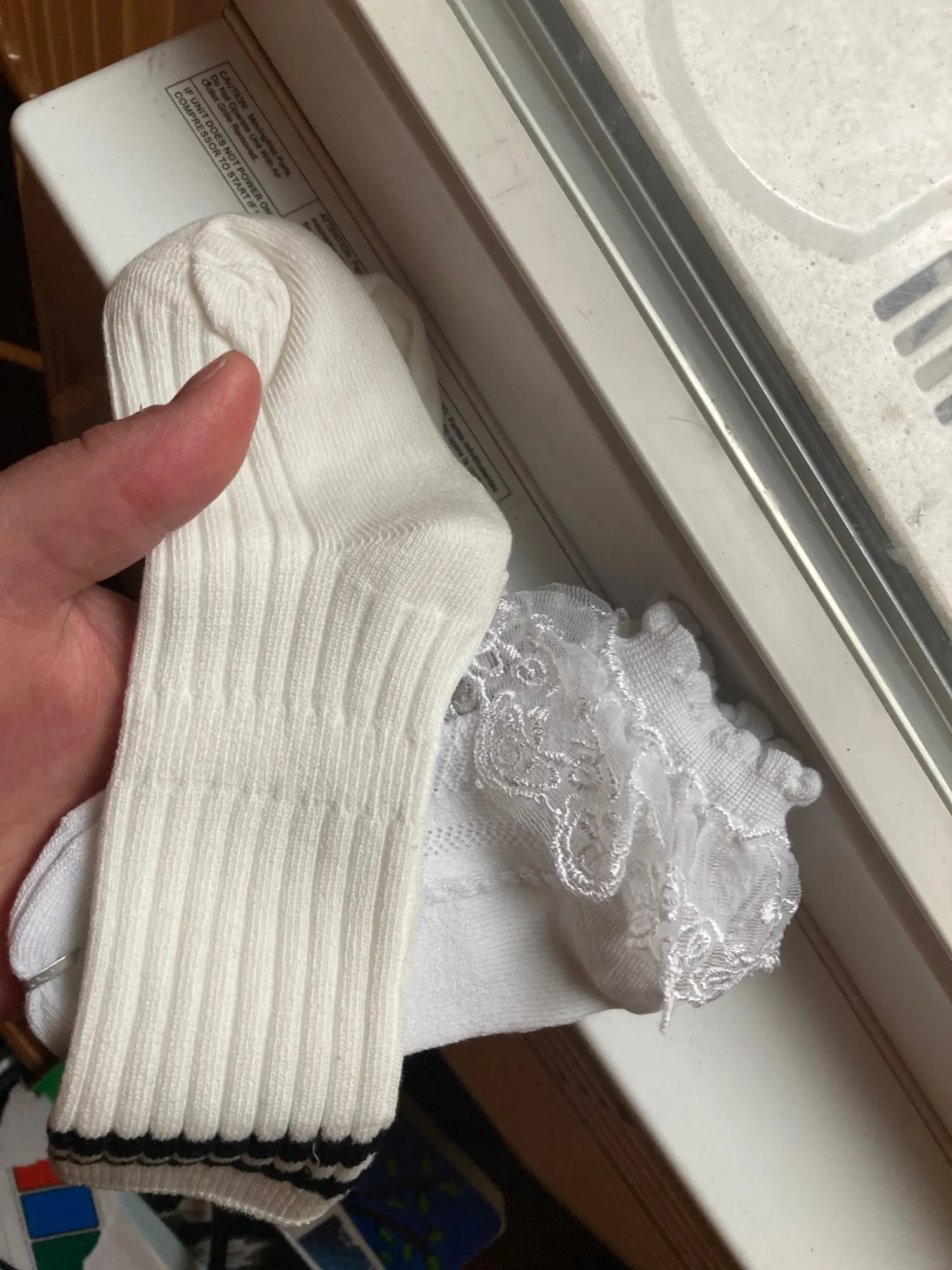 Носки такие белые, что я купил их для серых под лампой накаливания-сделали фото в естественном свете по сравнению с другой парой носков, которые, как я думал, были белыми (они, но теплые белые) чтобы показать, что они очень чисто белые. Кружево выглядит хорошо, никаких затяжек и ничего другого. Мы увидим, как они держатся!