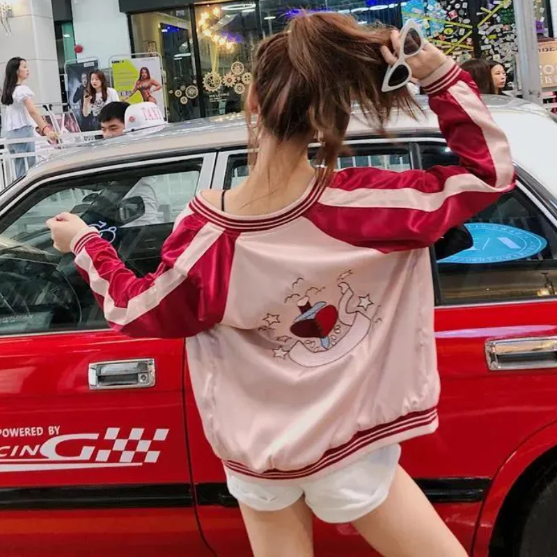 Двухсторонняя куртка-бомбер Yokosuka, атласная бейсбольная куртка на молнии, ретро-стиль, с вышивкой, сердца, парные летные костюмы, кардиган в стиле Харадзюку