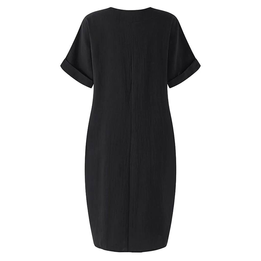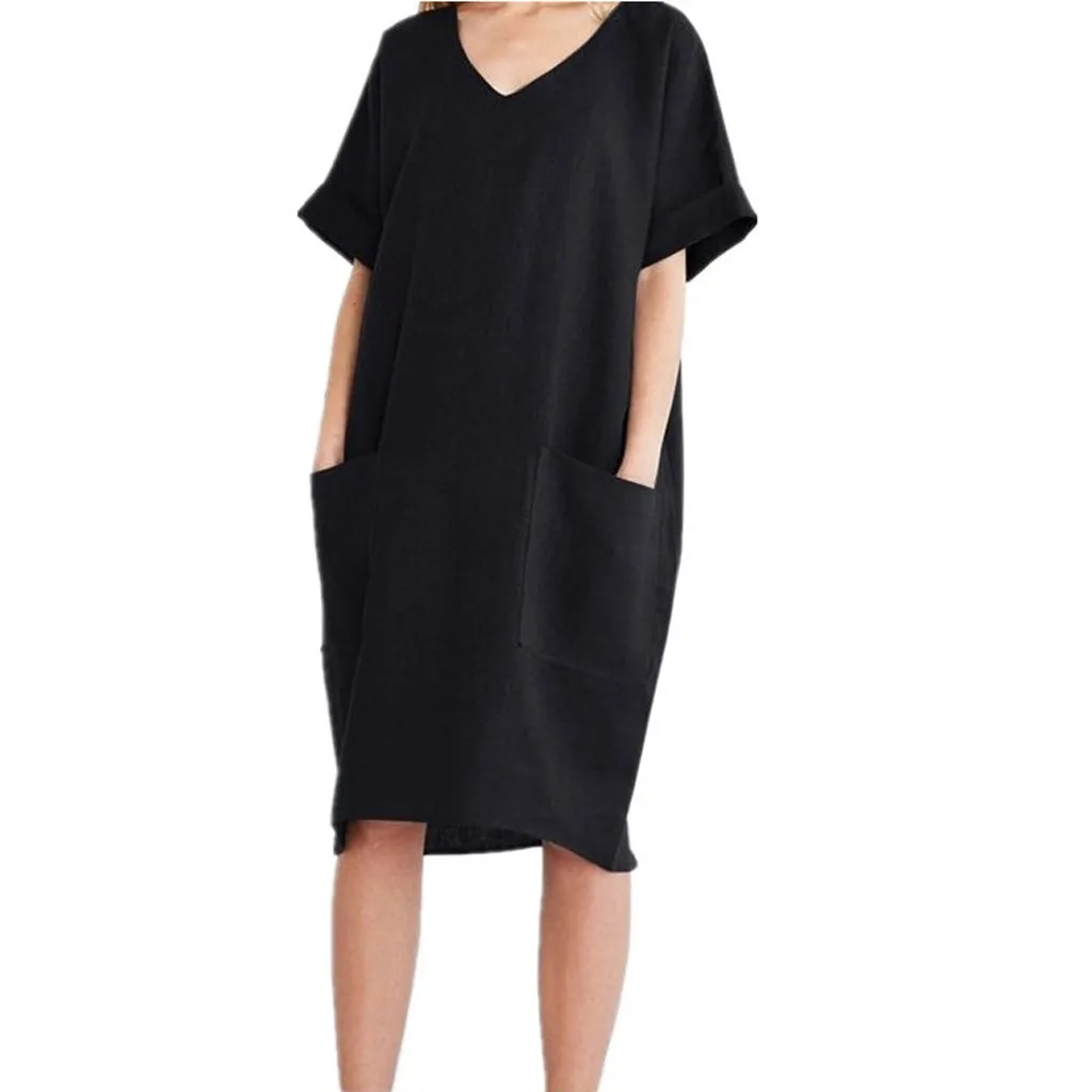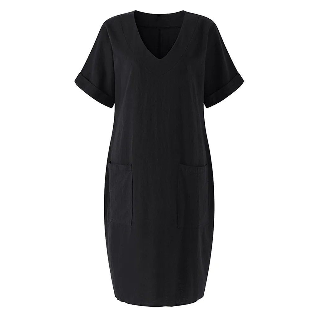 Женские свободные платья, повседневное однотонное женское платье с V-образным вырезом и коротким рукавом, повседневное льняное черное пляжное платье с карманами, платья 5XL # A3