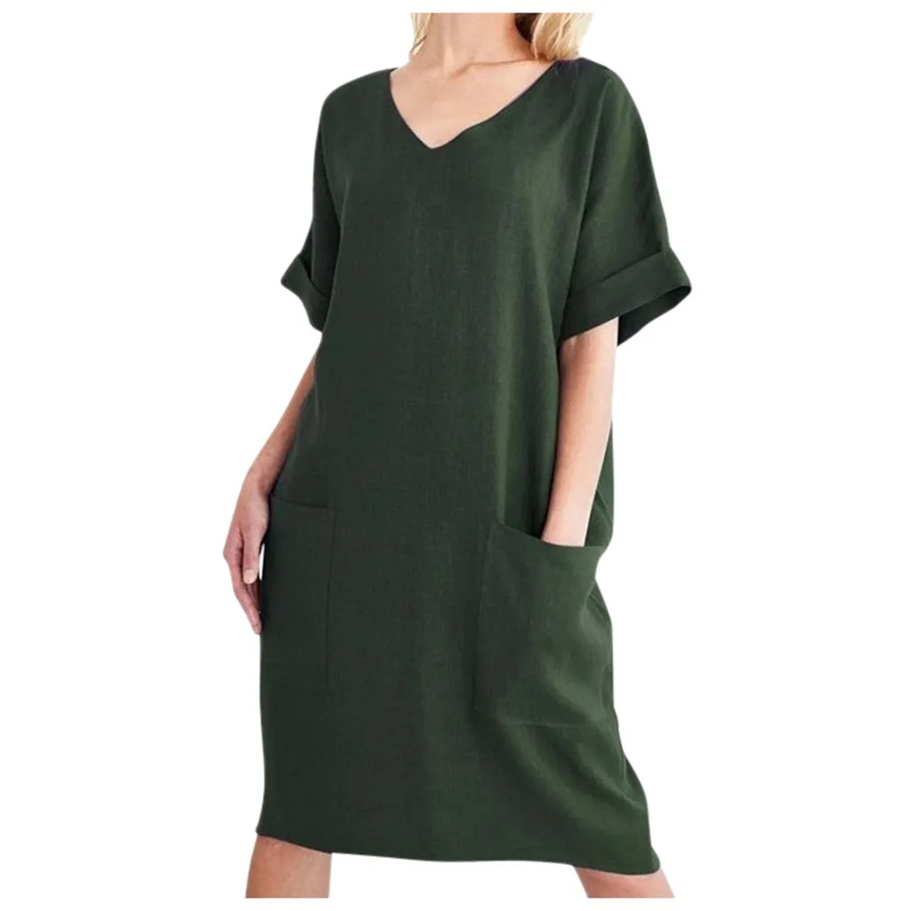 Женское летнее повседневное свободное однотонное длинное платье с v-образным вырезом и коротким рукавом и карманом