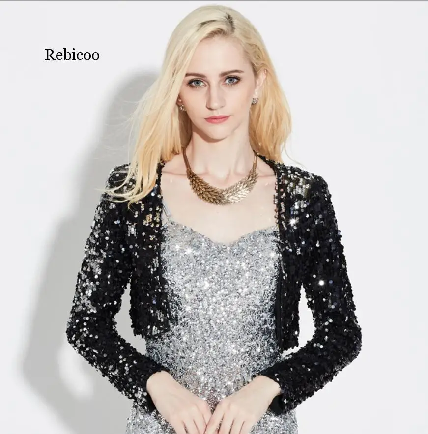 Блестящий сексуальный женский кардиган с блестками, куртка, пальто с длинным рукавом, короткий укороченный болеро, Клубная одежда, винтажные вечерние костюмы