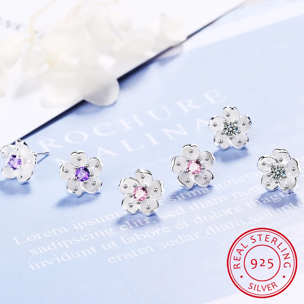 Женские серьги-гвоздики с цветком вишни, серьги из стерлингового серебра 925 пробы с розовымфиолетовымбелым цирконием, ювелирные украшения