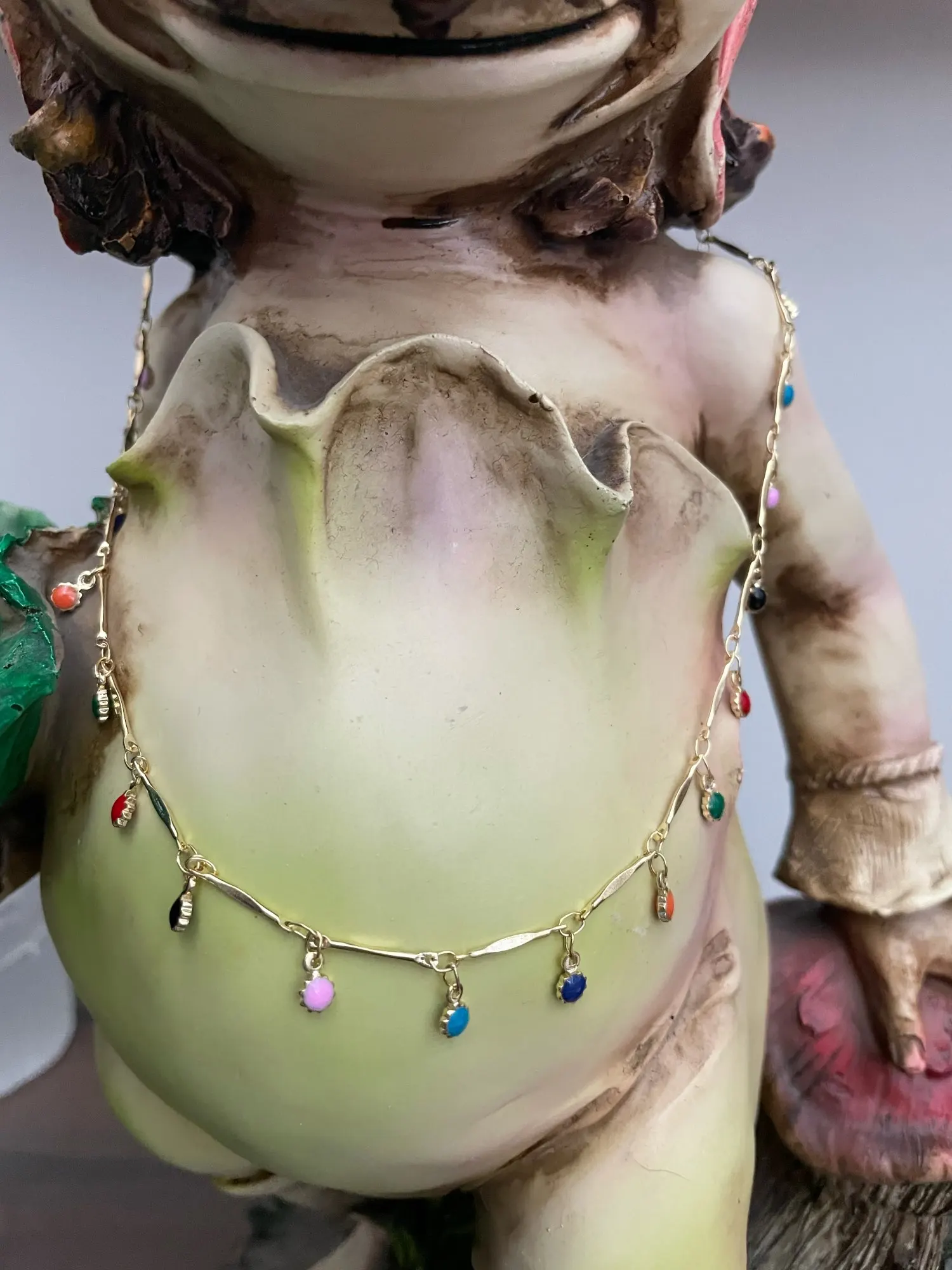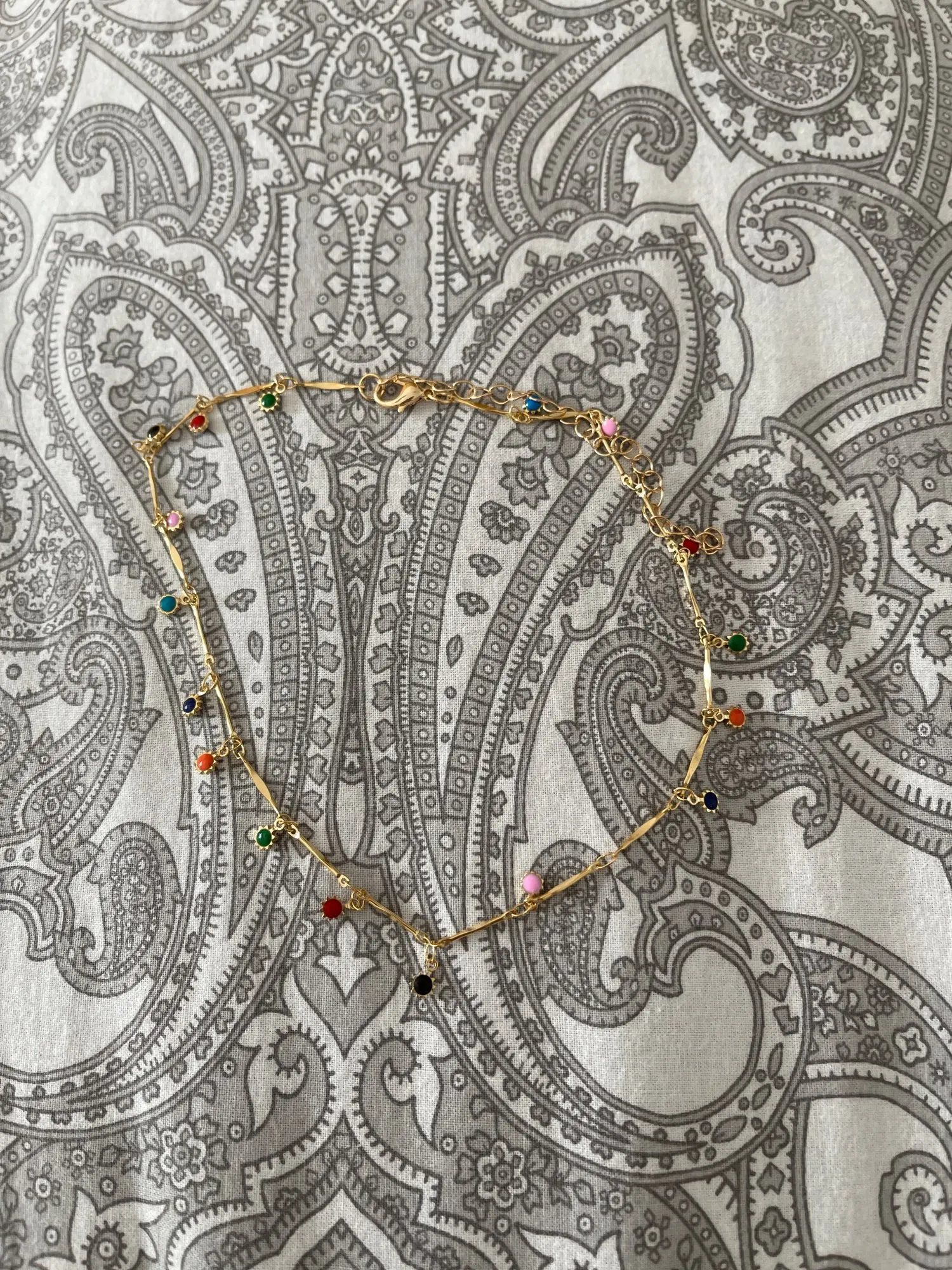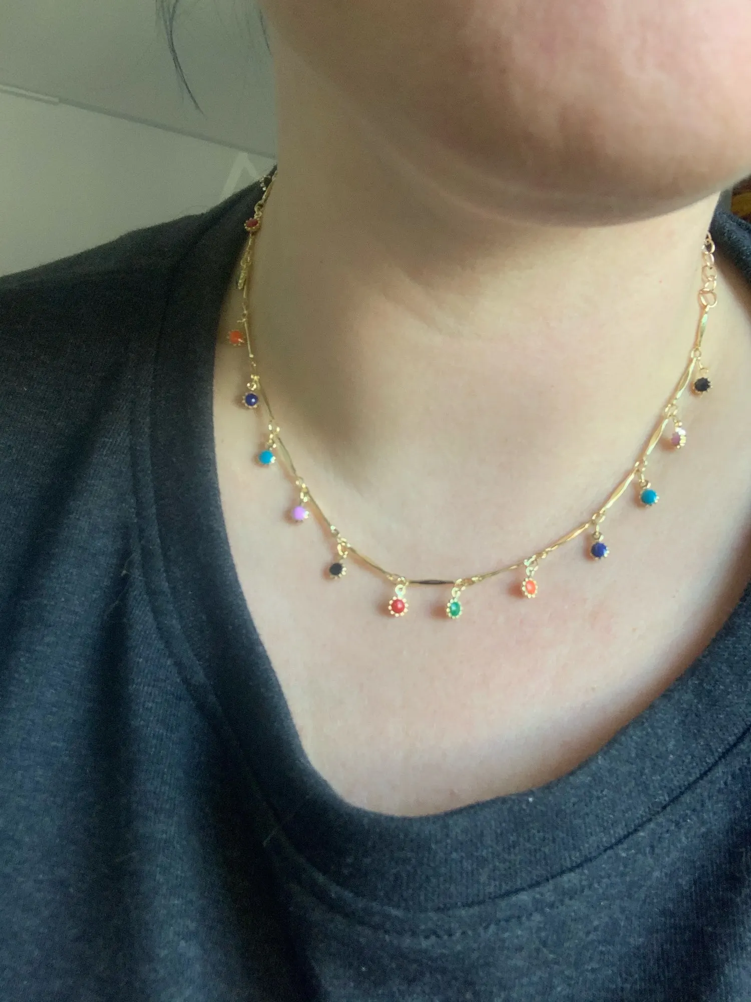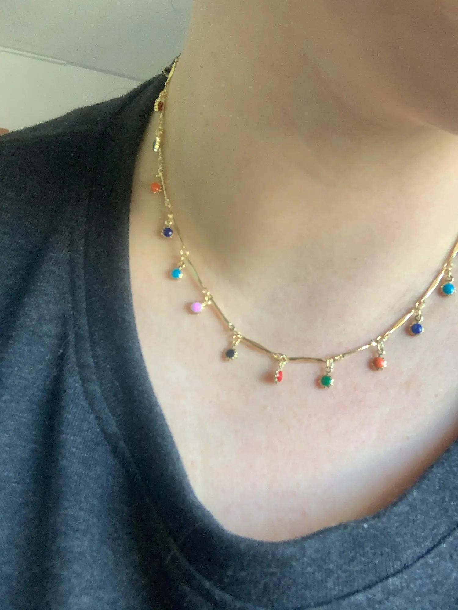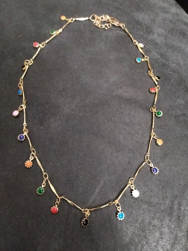 más bonito que en las fotos las flores son de colores vivos y por los dos lados, es decir, por detrás no es de color metal es de.colorines por lo que aunque se de la vuelta se ven los colores un mes en llegar tamaño corto no.sirve para cuello grueso