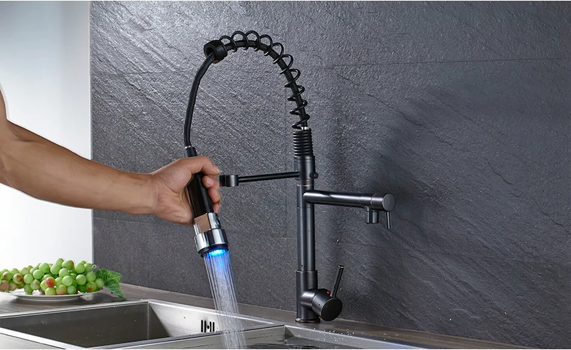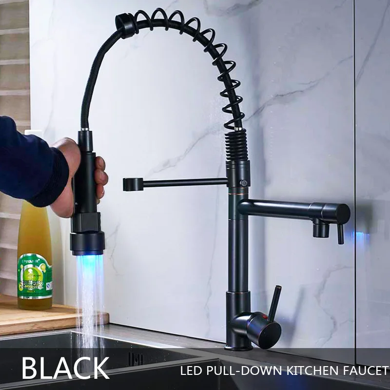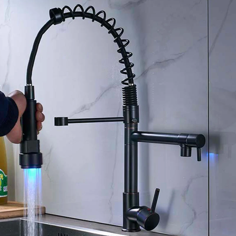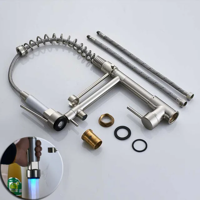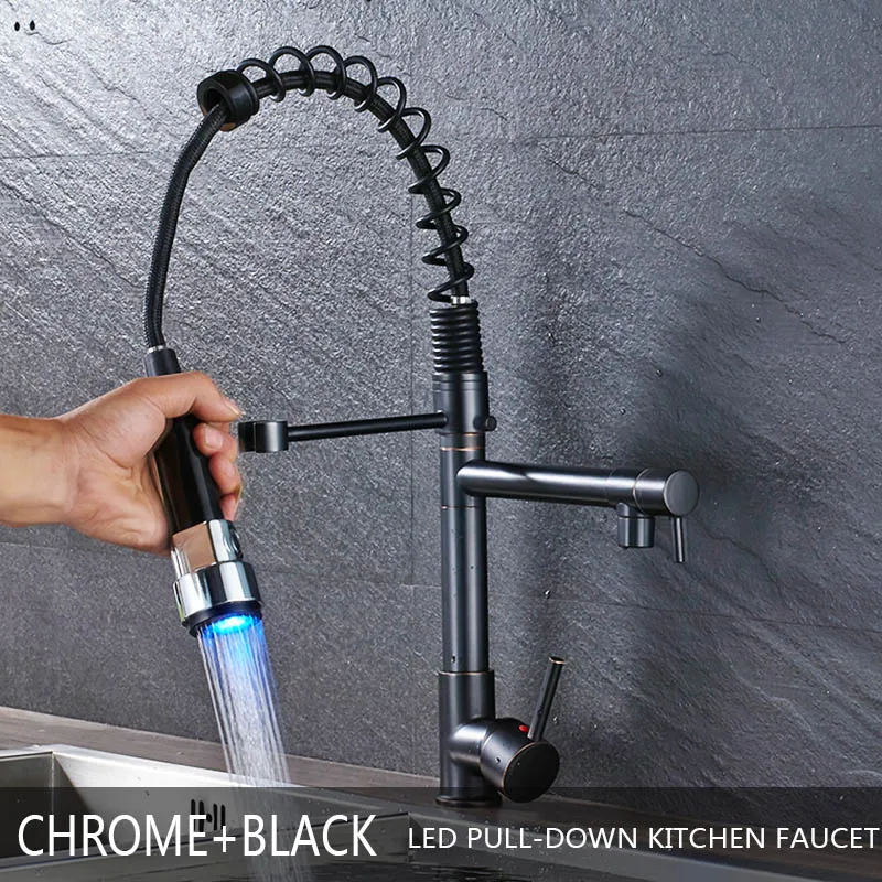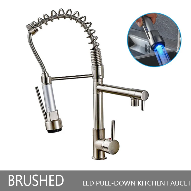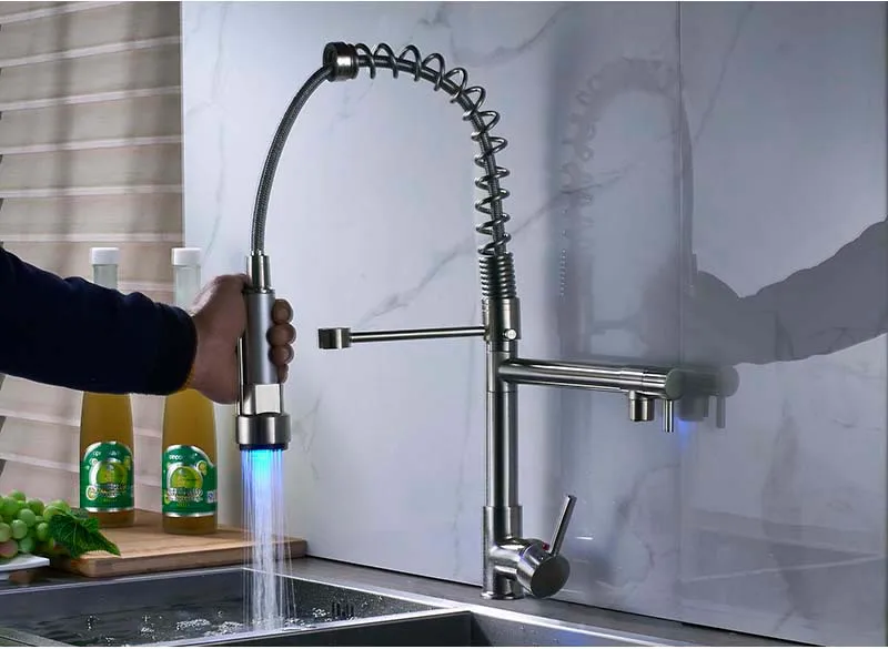 Пружинный смеситель для кухни, выдвижной пружинный смеситель со светодиодный светильник светкой, цвет розового золота, двойной поворотный носик, для горячей и холодной воды