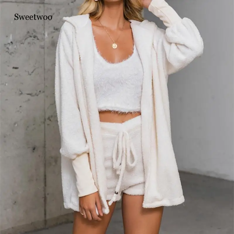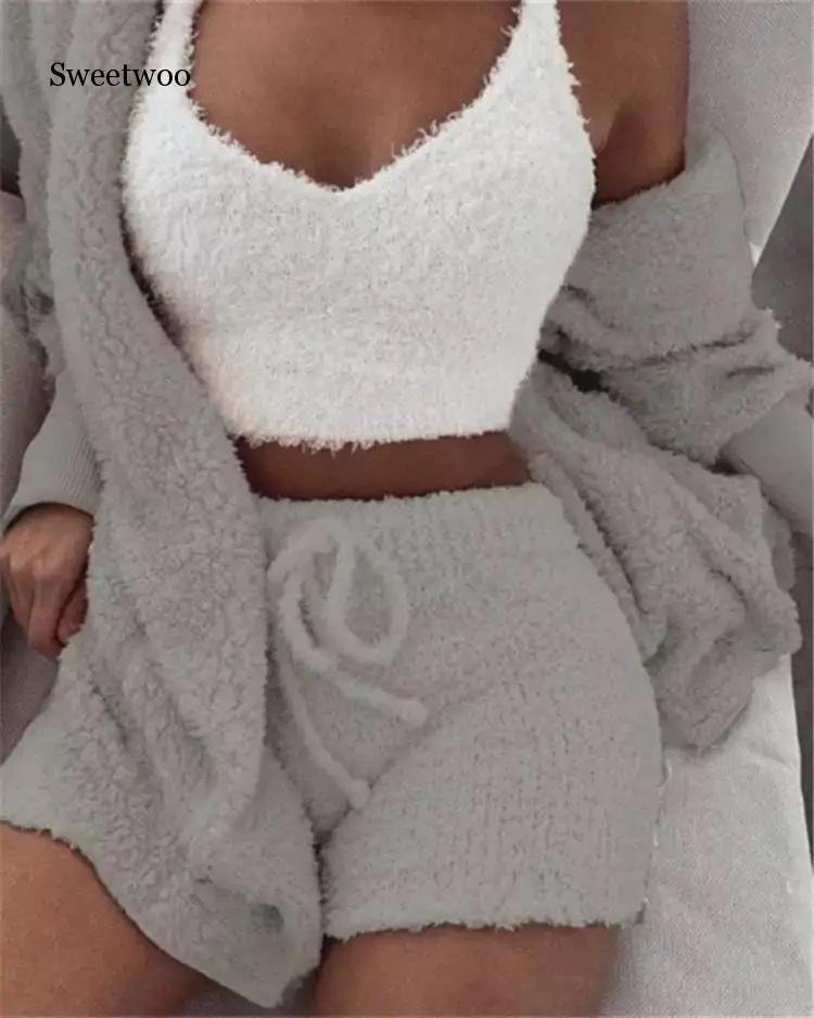 Женская одежда для отдыха, сексуальный комплект из 3 предметов размера плюс, укороченный топ, белый вязаный флисовый кардиган, шорты, наряды для ансамблей
