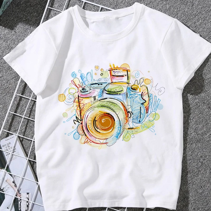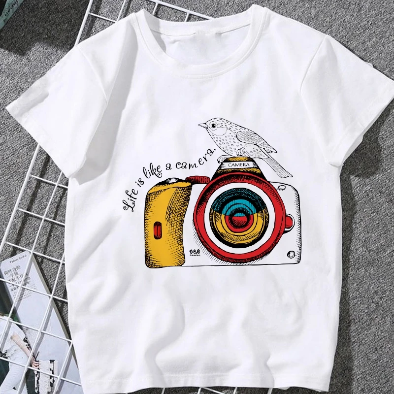 Женская футболка в стиле Харадзюку с изображением камеры и графического принта, летняя Модная Тонкая футболка с коротким рукавом, Повседневная Уличная футболка, топы