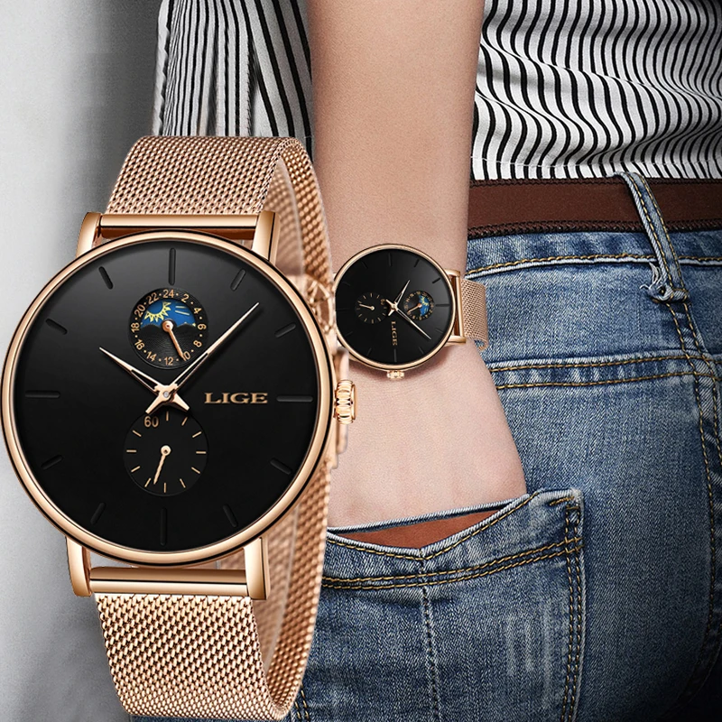 Часы LIGE женские с японским кварцевым механизмом, водонепроницаемые из нержавеющей стали под розовое золото, 12 мм, с сетчатым ремешком, Прямая поставка
