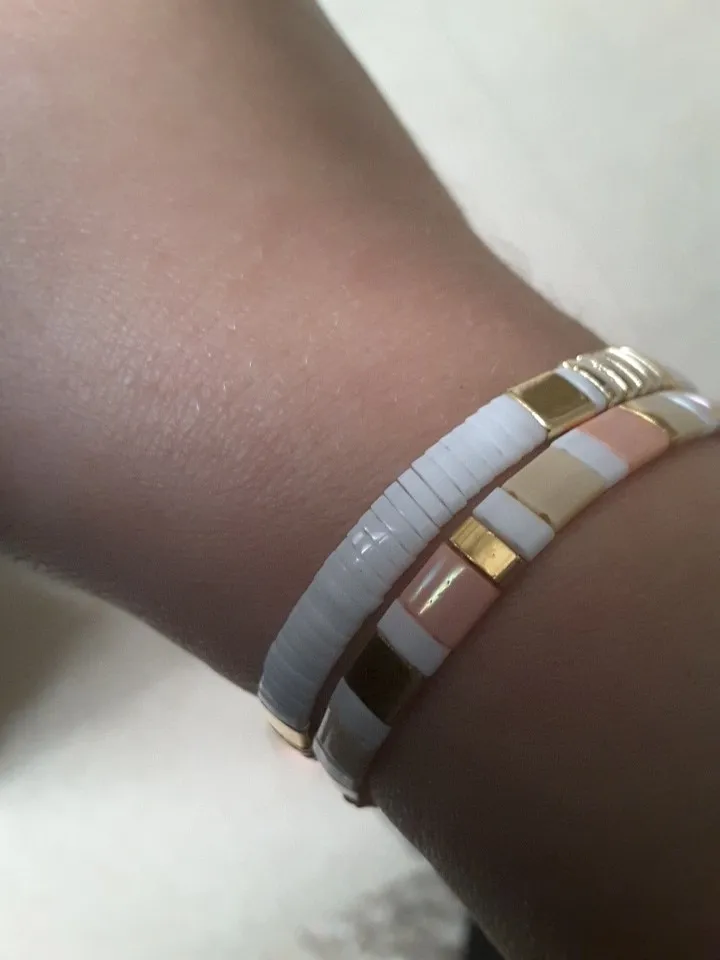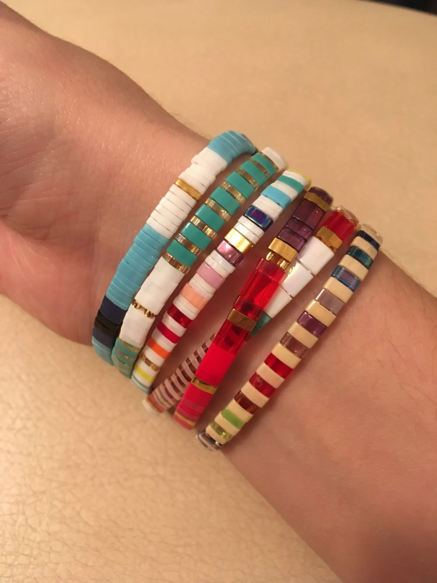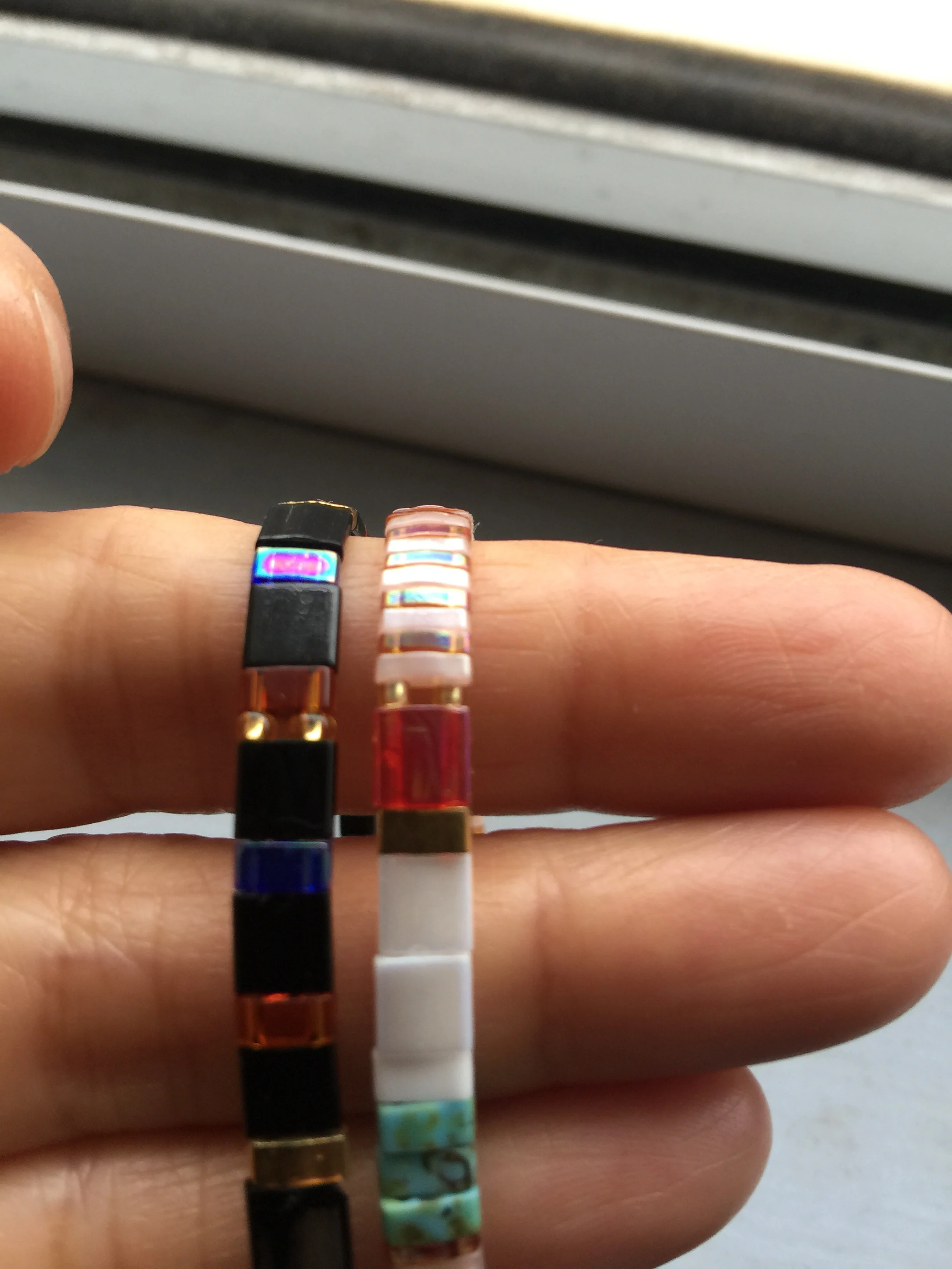 доставка очень быстрая, всего 2 недели) заказывала два, милый продавец положил третий в подарок, спасибо за это, а так же за прекрасный товар. браслетики очень симпатичные, смотрятся стильно и ярко. они вроде из стекла. рекомендую магазин