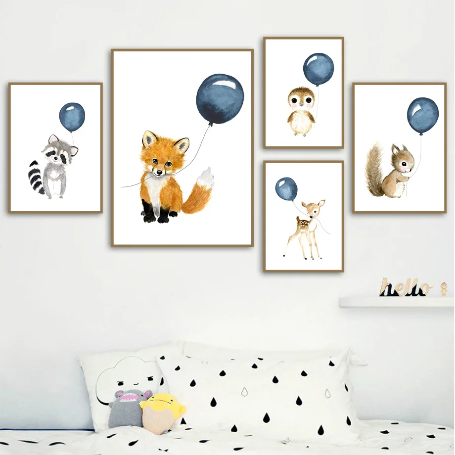 Настенная Картина на холсте, милая енота, белка, пингвин, воздушный шар, скандинавские постеры и принты, декор детской комнаты