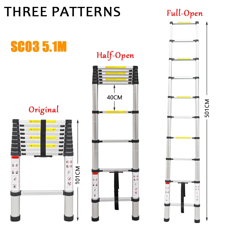 1) Название продукта: телескопические лестницы2) Модель: SC03 5,1 M3) Макс. Вес: 150 кг4) Высота в сложенном виде (оригинал):101 см5) открытая высота (Full-в разложенном виде): 5,1 м6) шаги: 137) расстояние шага: 40 см8) Материал: алюминий9) Структура: одиночные прямые лестницы10) Вес: 13,3 кг11) Использование: домашнее хозяйство, промышленность12) Размер посылка: 104 × 49 × 9