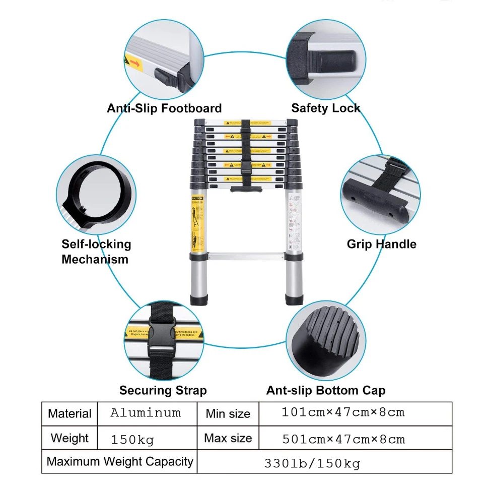 1) Складная конструкция, удобная в использовании и легко носить с собой2) Эта лестница может быть быстро расширена и отрегулирована, чтобы соответствовать любой высоте в пределах максимальной длины3) легкий, компактный, прочный, портативный4) можно сложить в компактный размер для удобного хранения и транспортировки5) Подходит для наружного и внутреннего использования