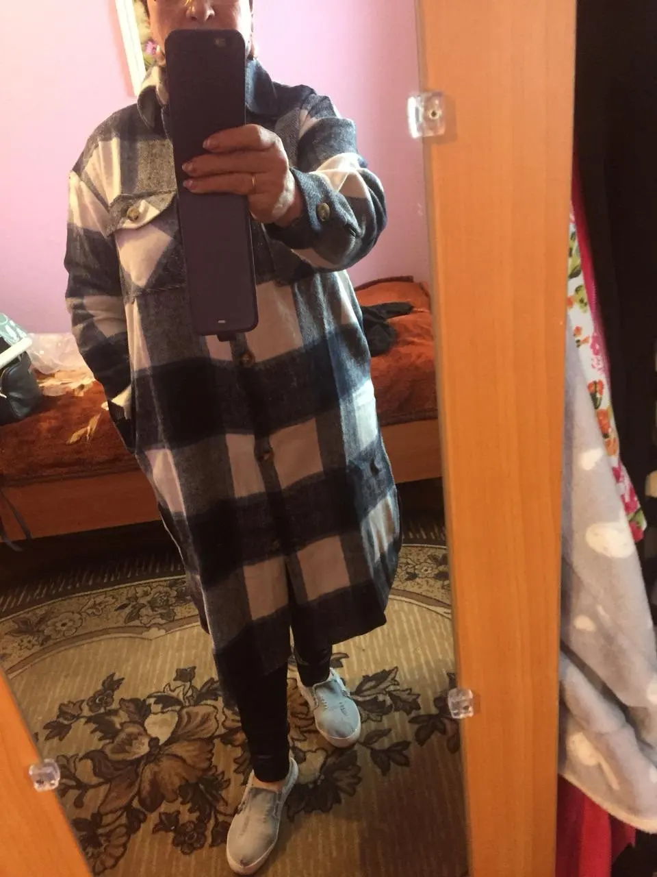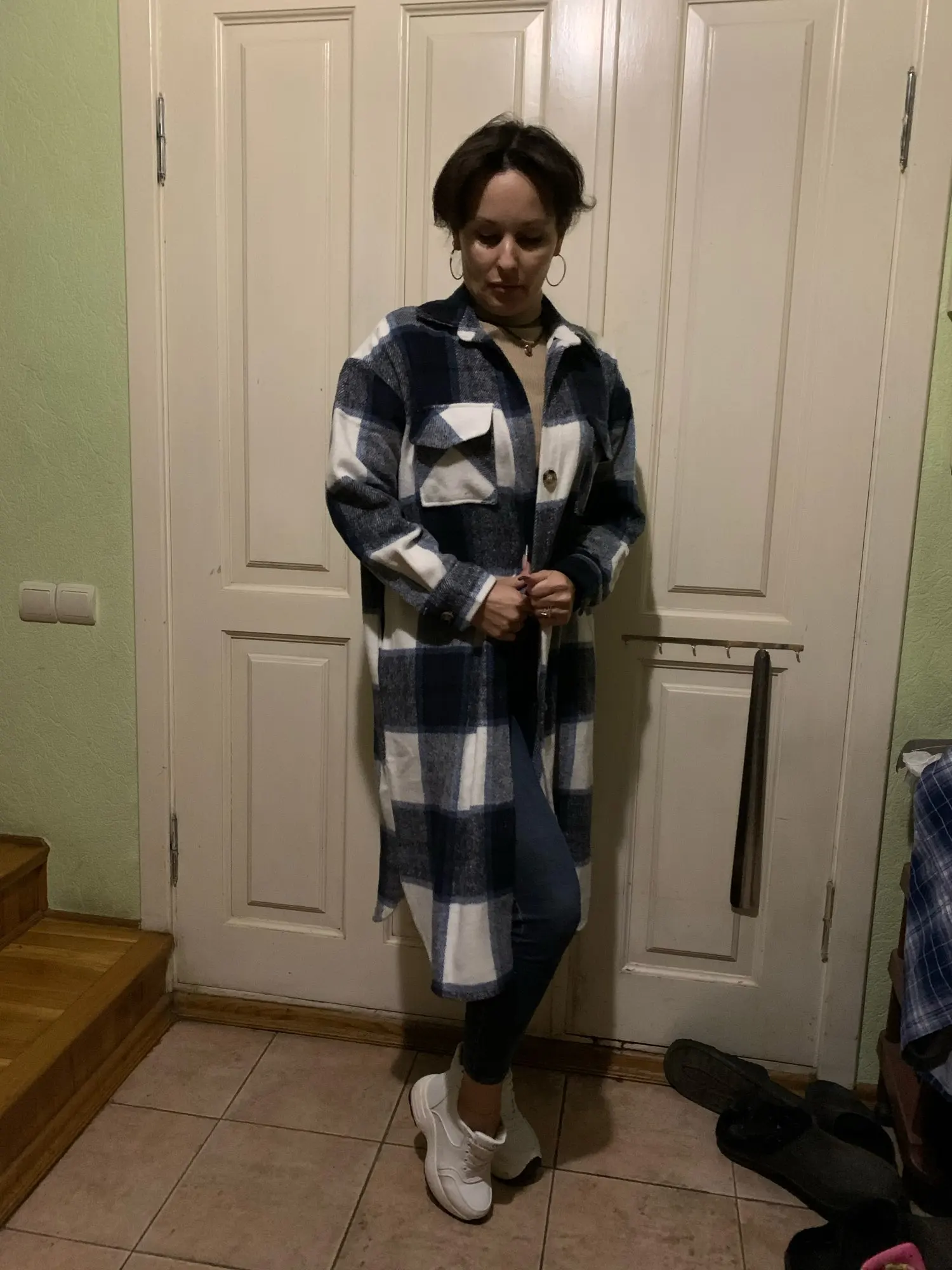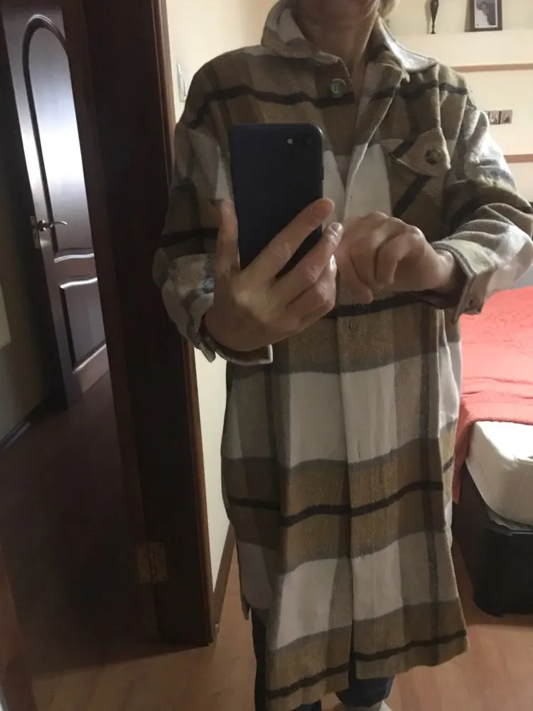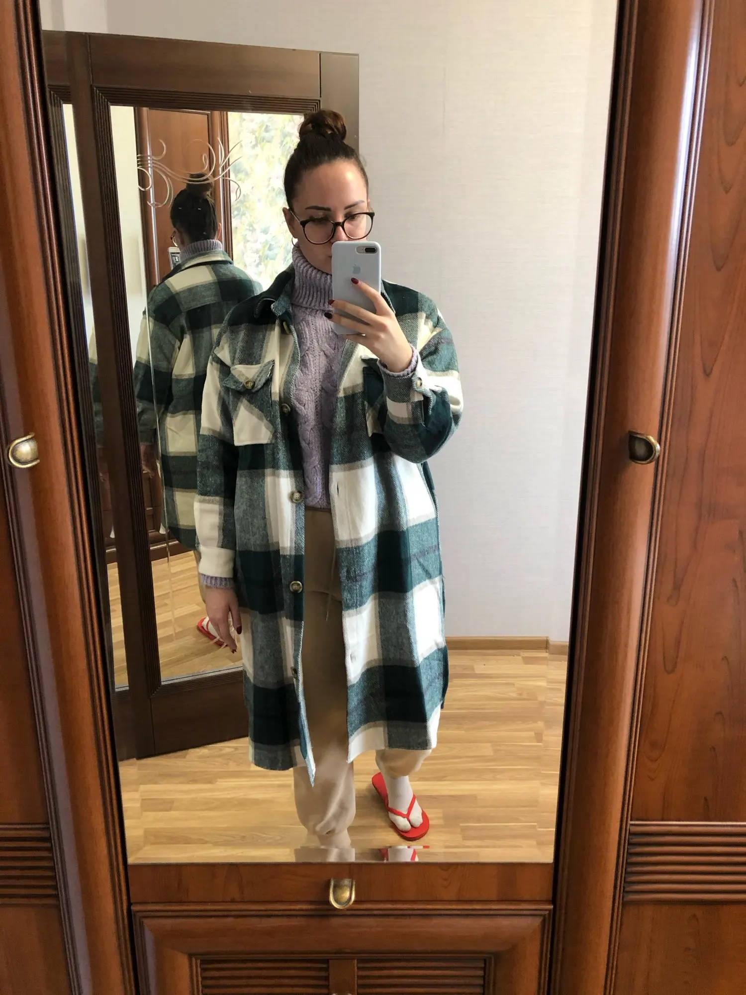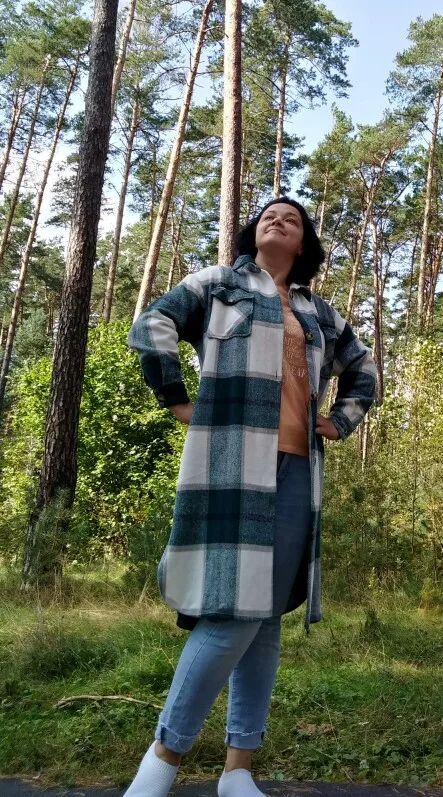 Тёплая и уютная рубашка, ношу как пальто, на рост 152 см длинная, как по мне. Если под каблук, то норм, под кроссовки мне пока не нравиться, заказала к ней пояс, думаю будет не плохо