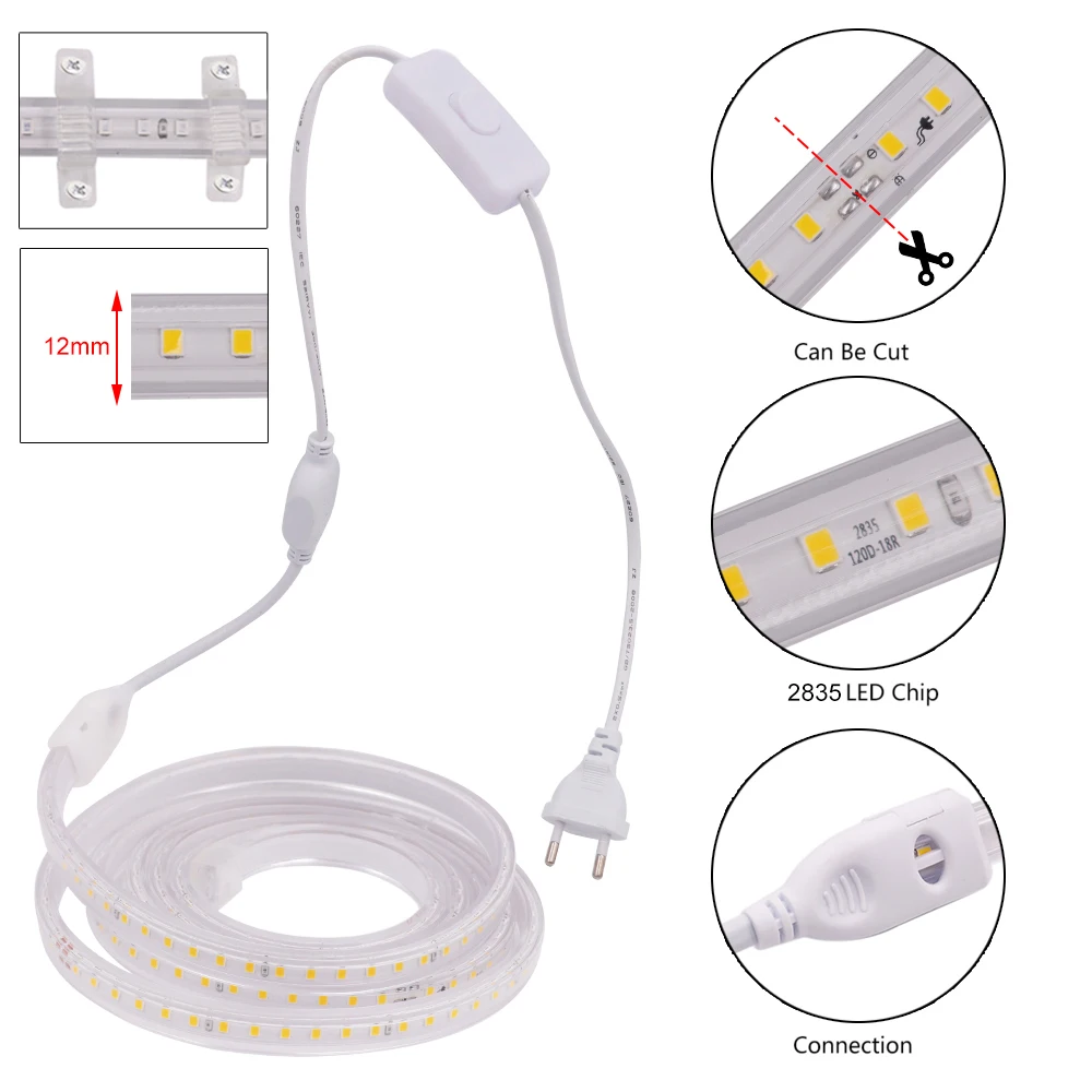 Светодиодная ленсветильник 220 В, 2835 светодиодов, водонепроницаемая гибкая светодиодная лента 60 светодиодовм высокой яркости с выключателем ВКЛ.ВЫКЛ., штепсельная вилка европейского стандарта