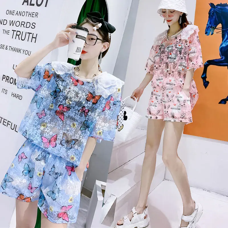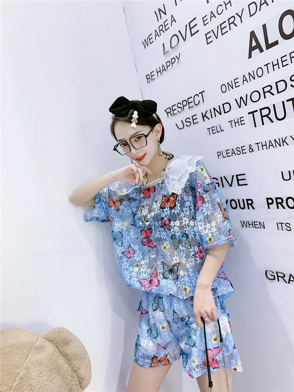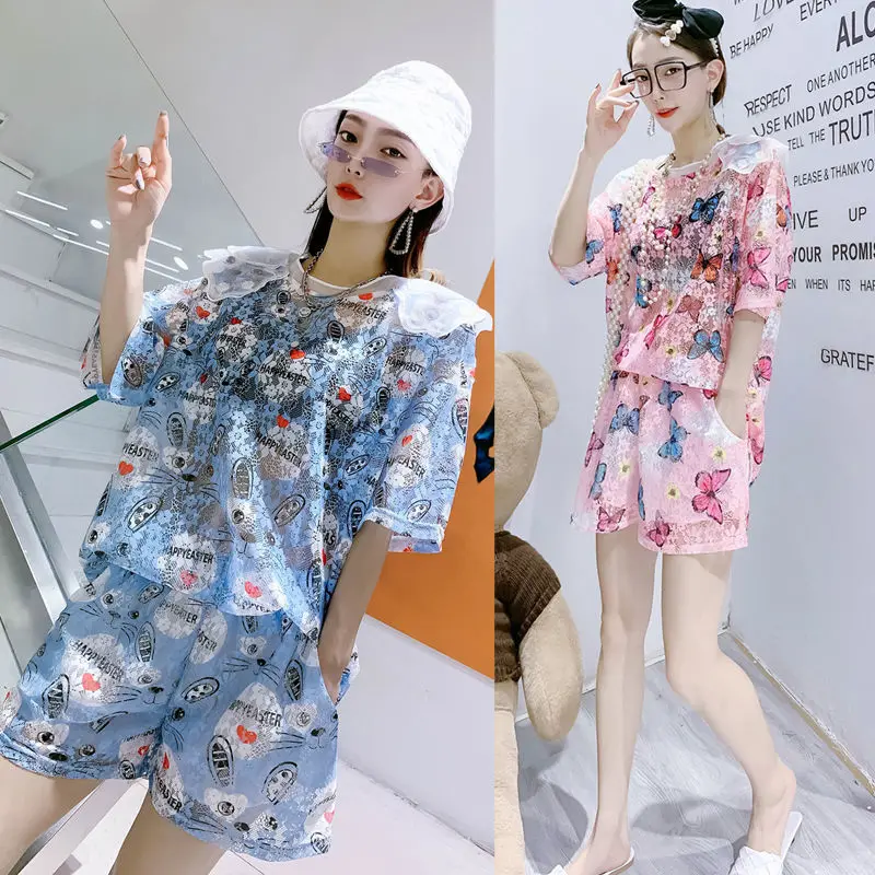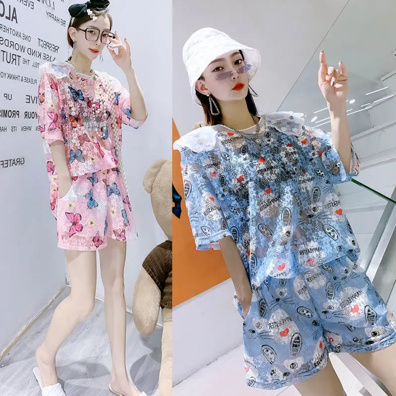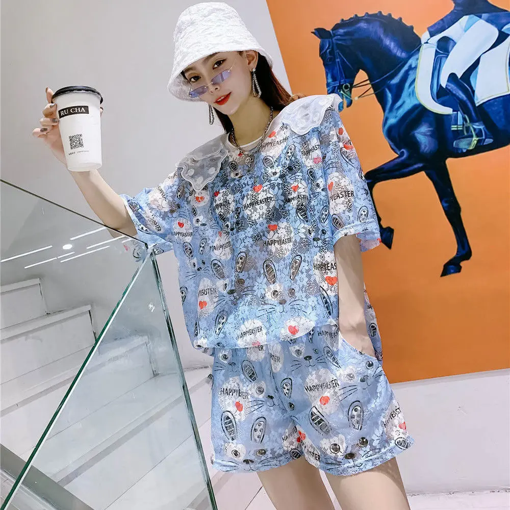 Комплект из 2 предметов, новый дизайн, женские летние комплекты одежды, кружевные свободные блузки с мультяшным принтом, топы и вечерние комплекты с шортами, NS652