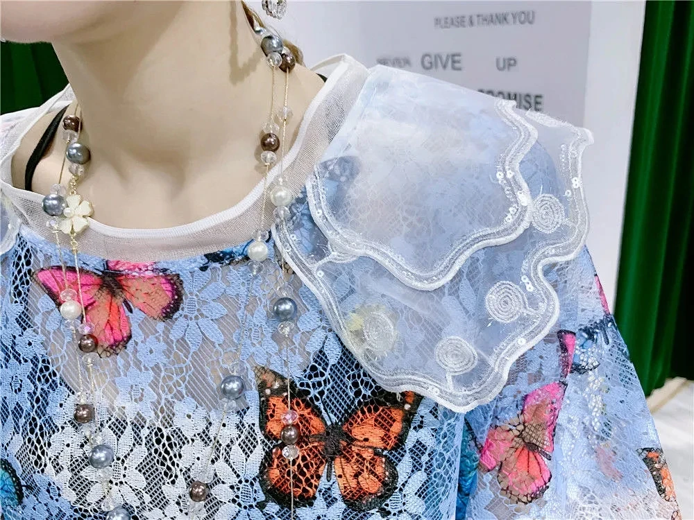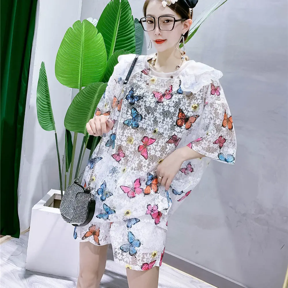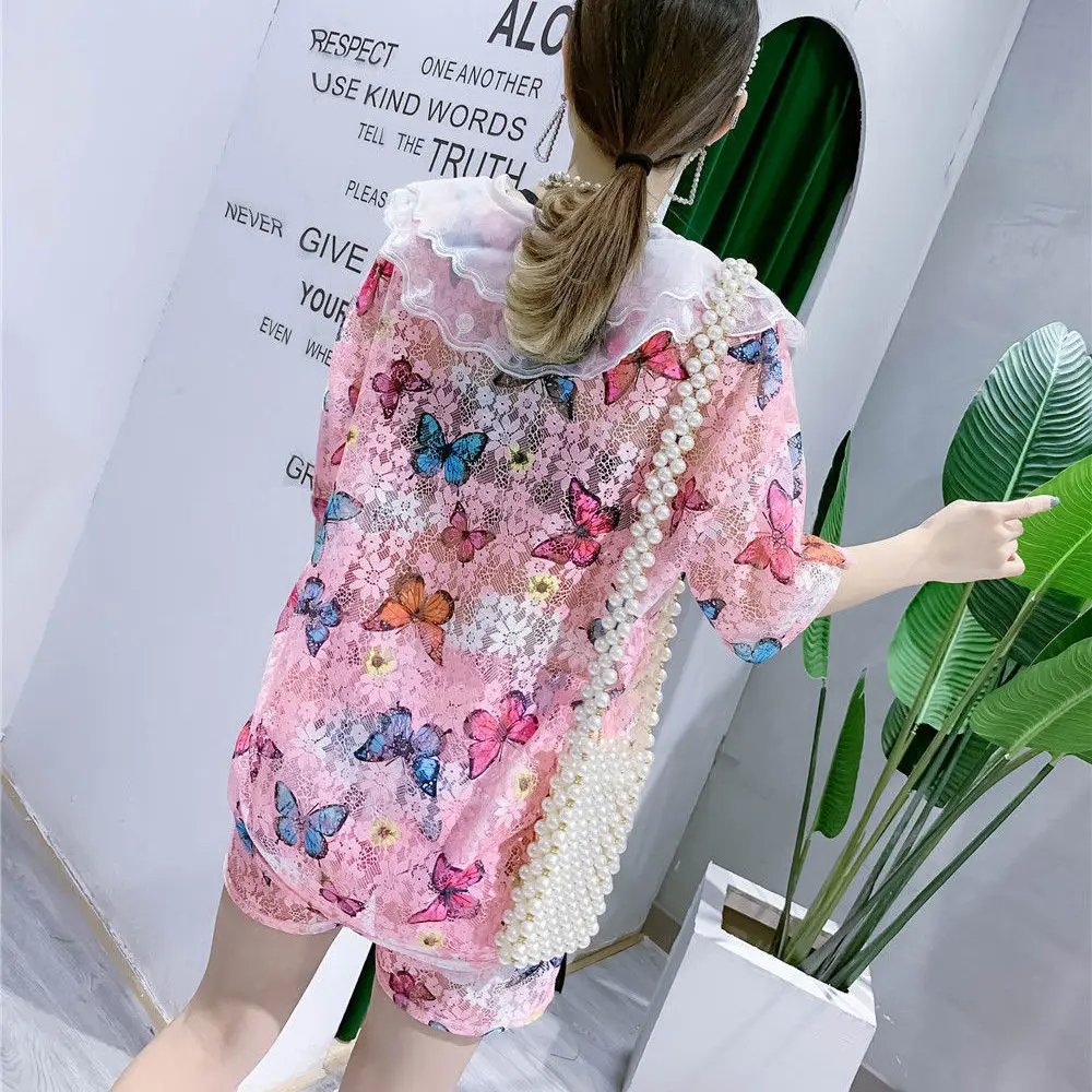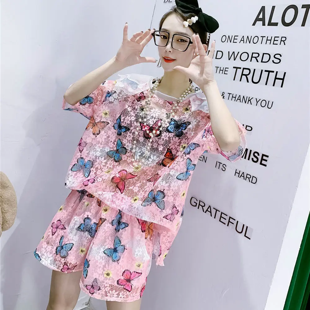 Комплект из 2 предметов, новый дизайн, женские летние комплекты одежды, кружевные свободные блузки с мультяшным принтом, топы и вечерние комплекты с шортами, NS652