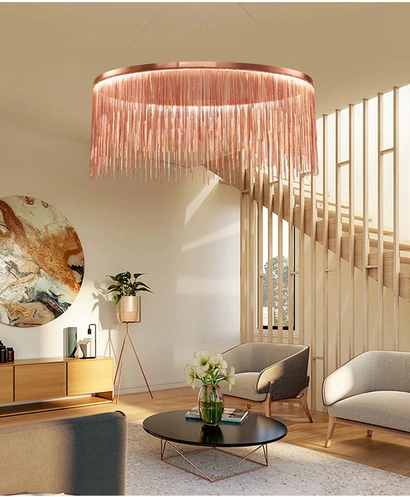 Современный Креативный алюминиевый подвесной светильник с кисточками, круглый светодиодный светильник с регулируемой яркостью цвета розового золота и серебра для гостиной