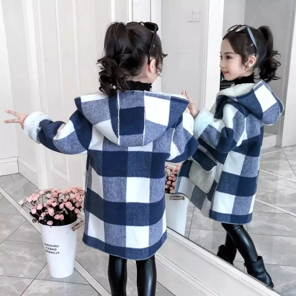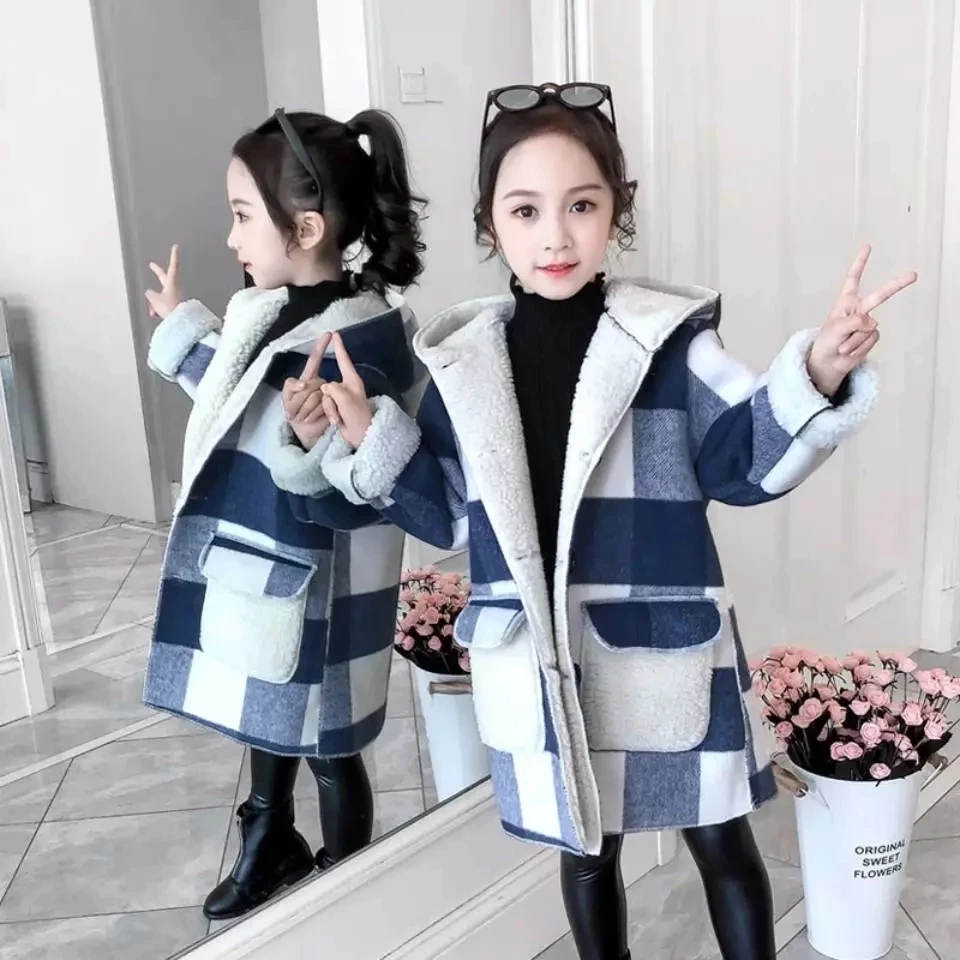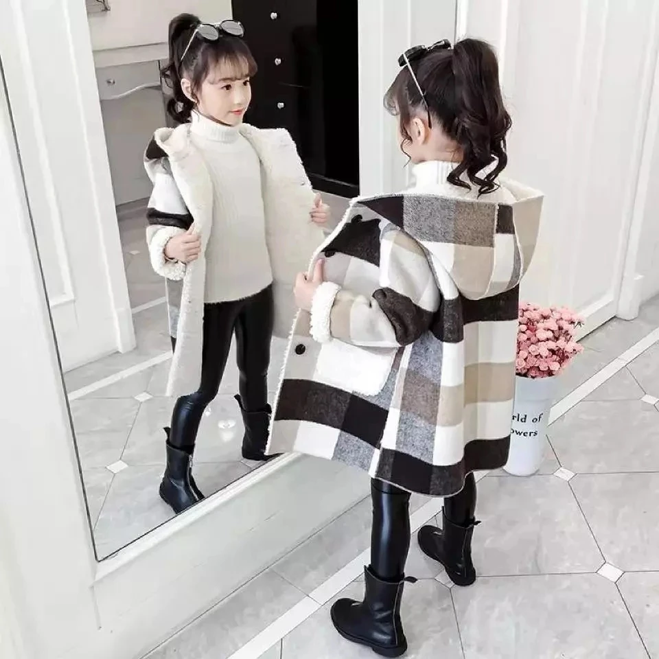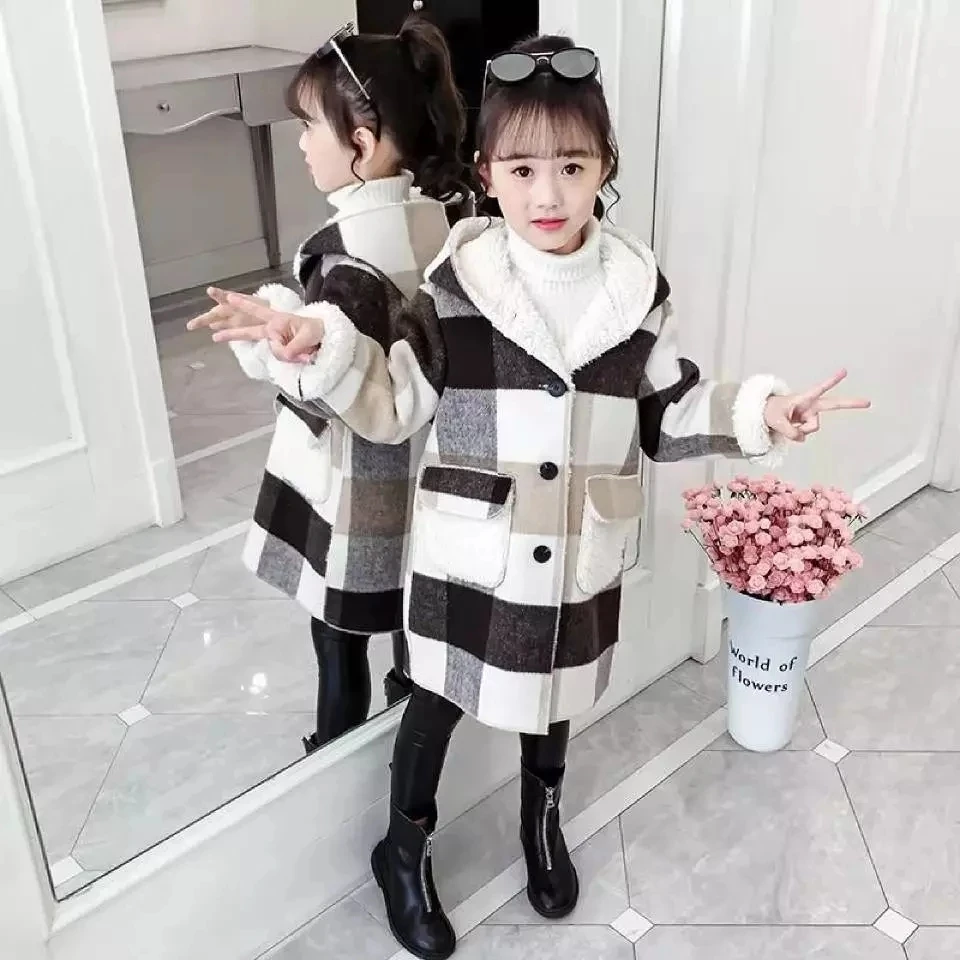 Новинка 2021, осенне-зимние детские куртки для девочек, верхняя одежда, теплые шерстяные ветровки, пальто, 2 цвета, плюшевые толстовки, клетчатая одежда