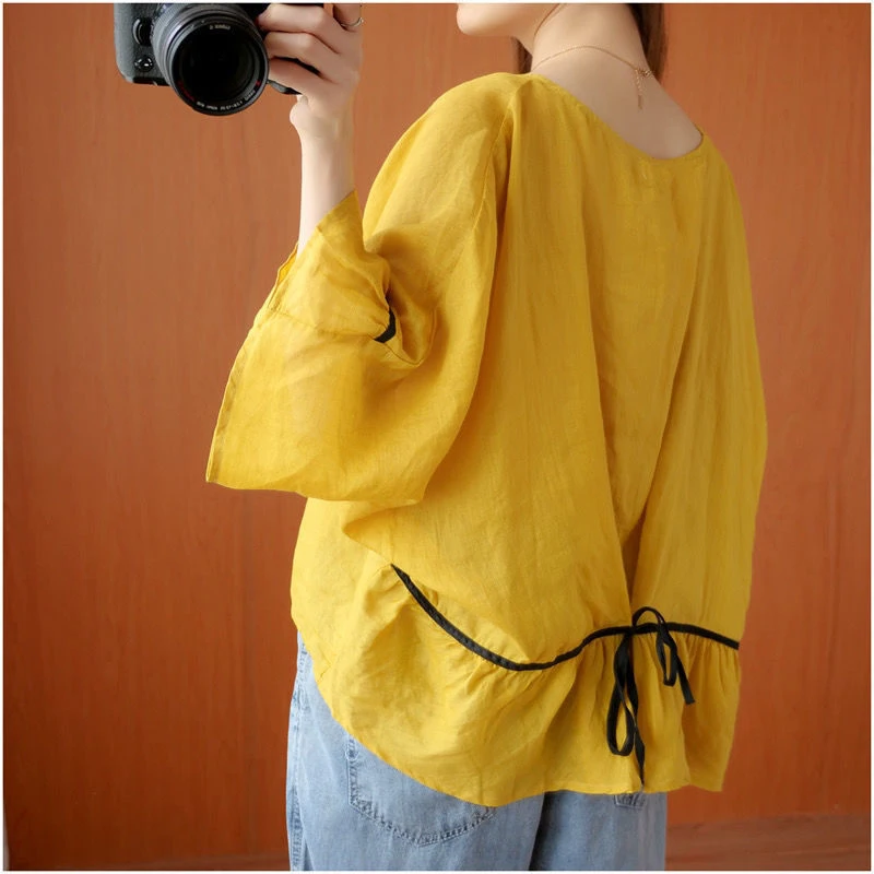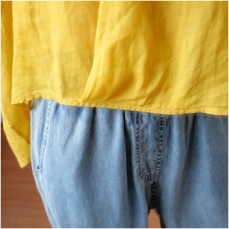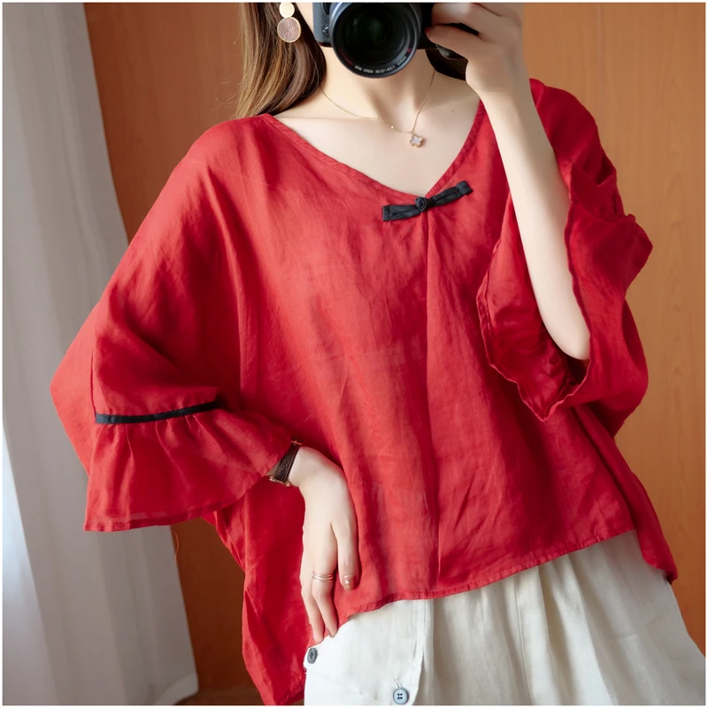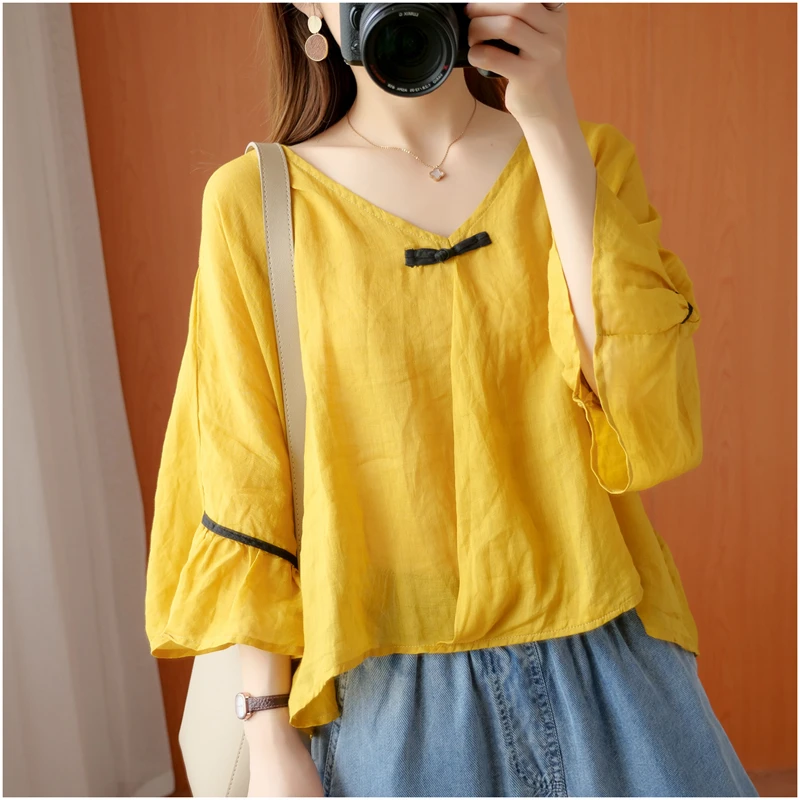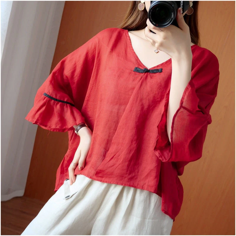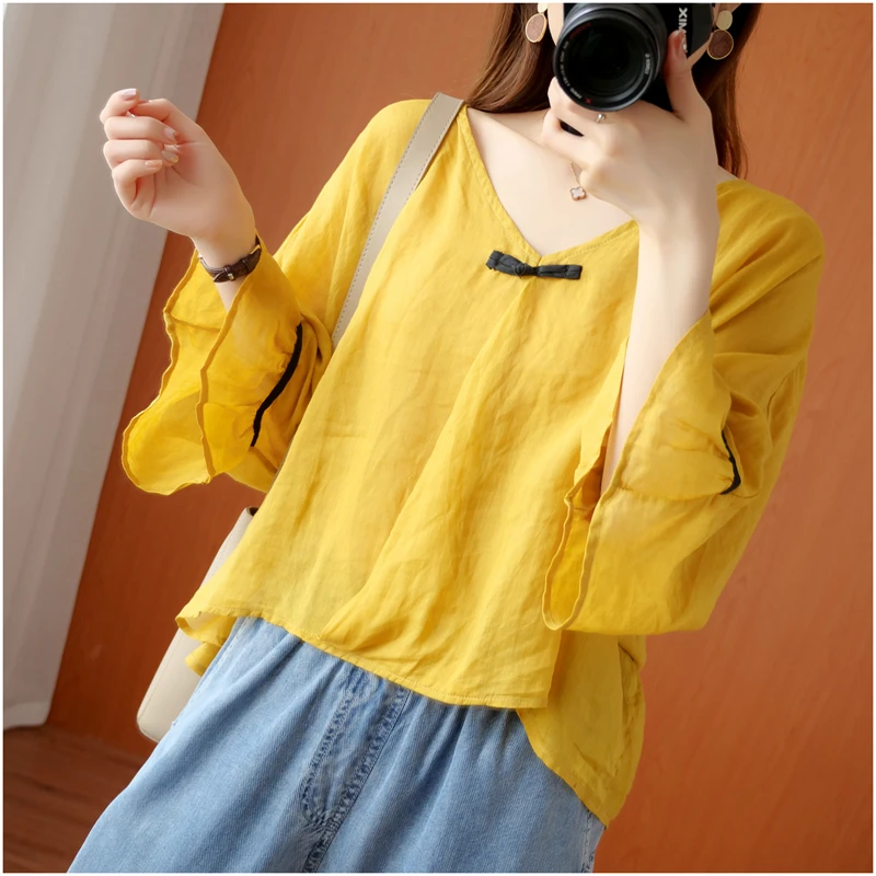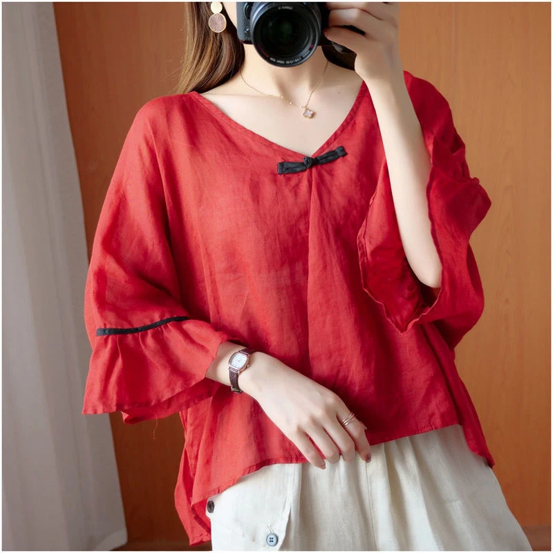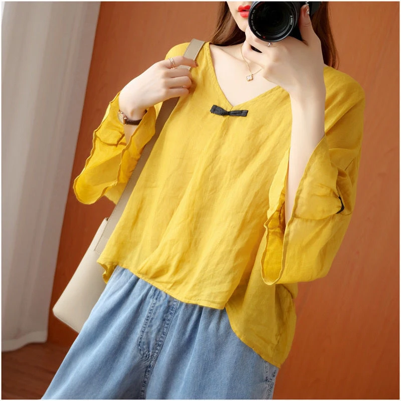 Женская свободная футболка с коротким рукавом и v-образным вырезом, повседневная хлопковая льняная футболка большого размера M155, лето 2020