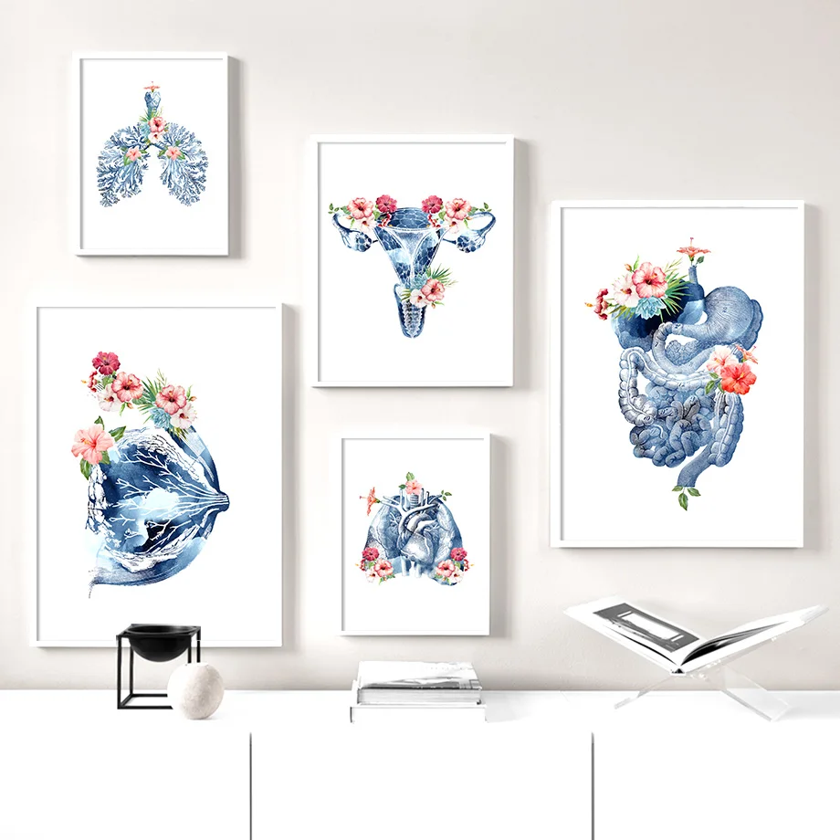 Плакаты и принты в скандинавском стиле с изображением синего цветка человеческих органов, груди и легких, настенная Картина на холсте, настенные картины для украшения врачей