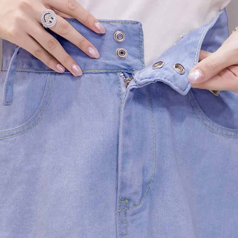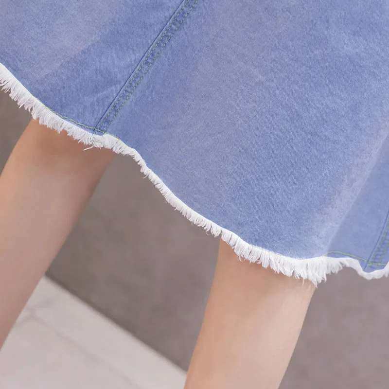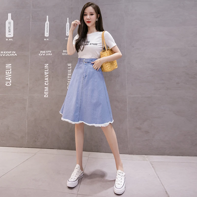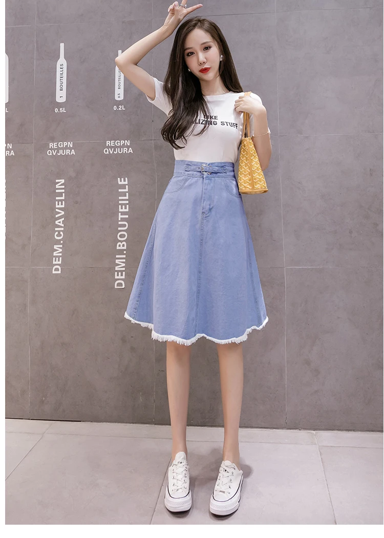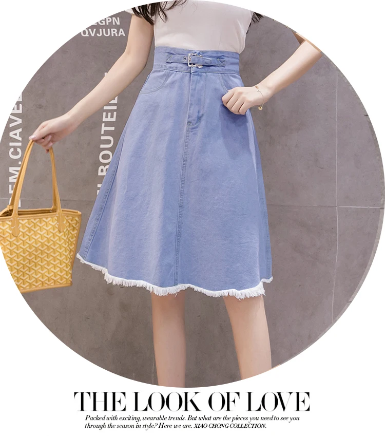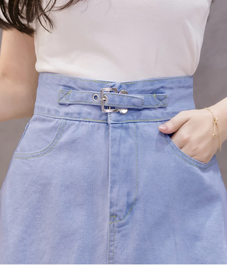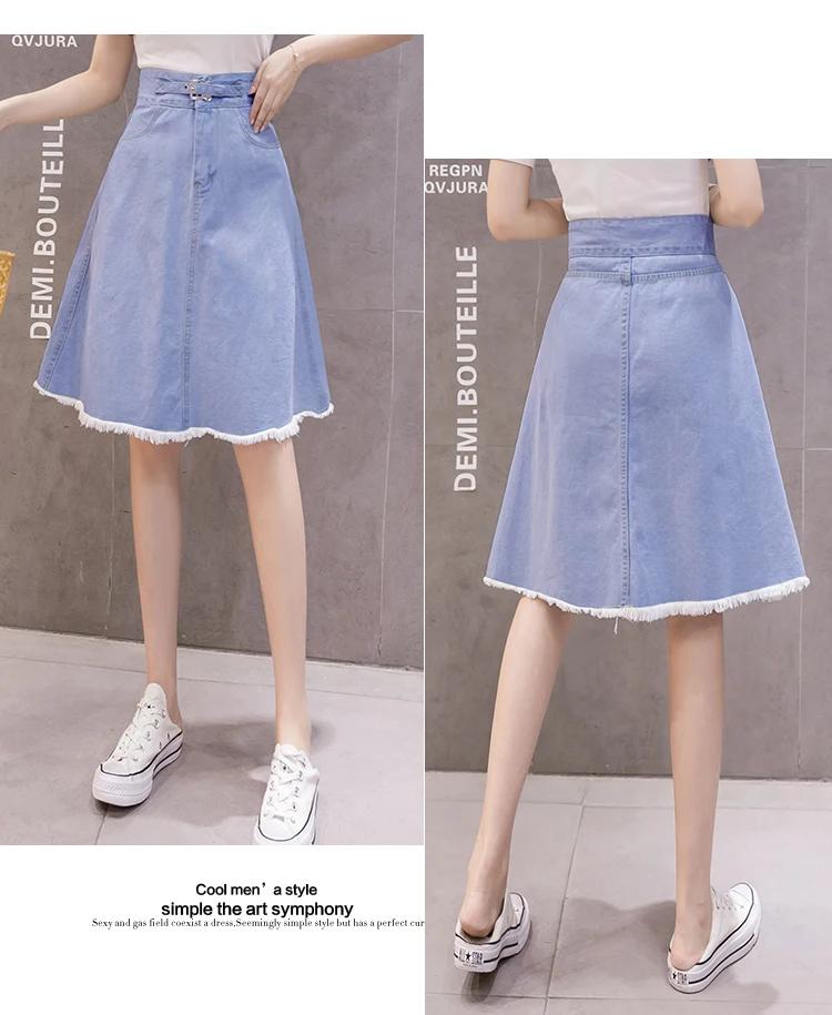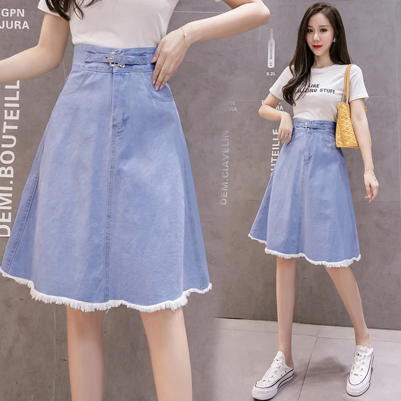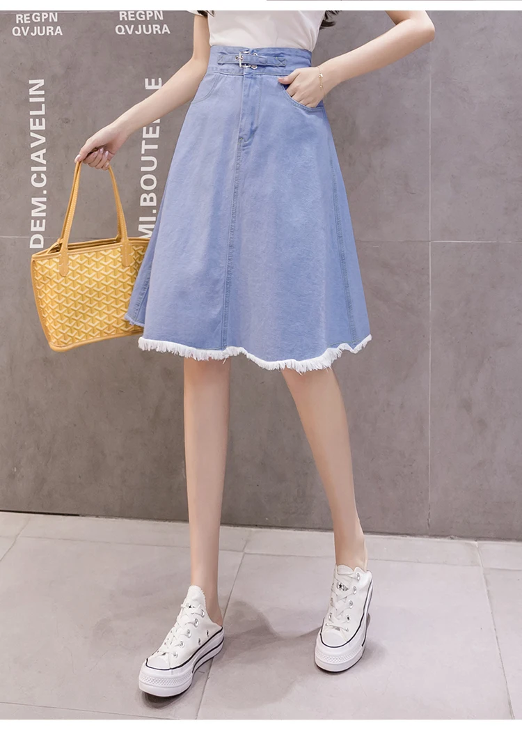 Юбка джинсовая трапециевидная с завышенной талией и карманами, элегантная небесно-голубая джинсы Midi юбка из денима в Корейском стиле с бахромой и поясом, 2020