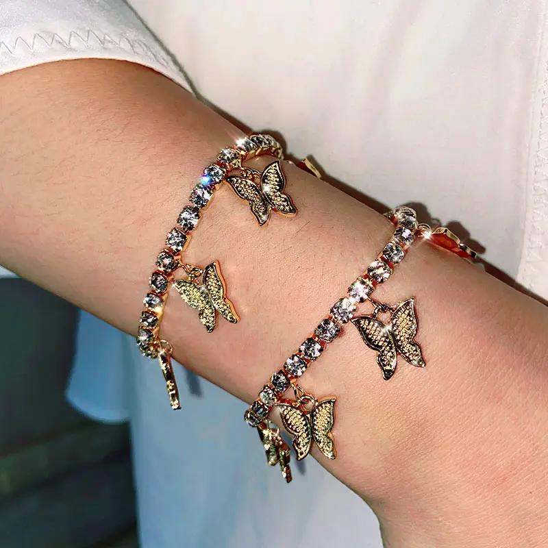 Женский браслет-цепочка с кристаллами, из металла золотого и серебряного цвета, браслет с подвесками бабочки, 2020