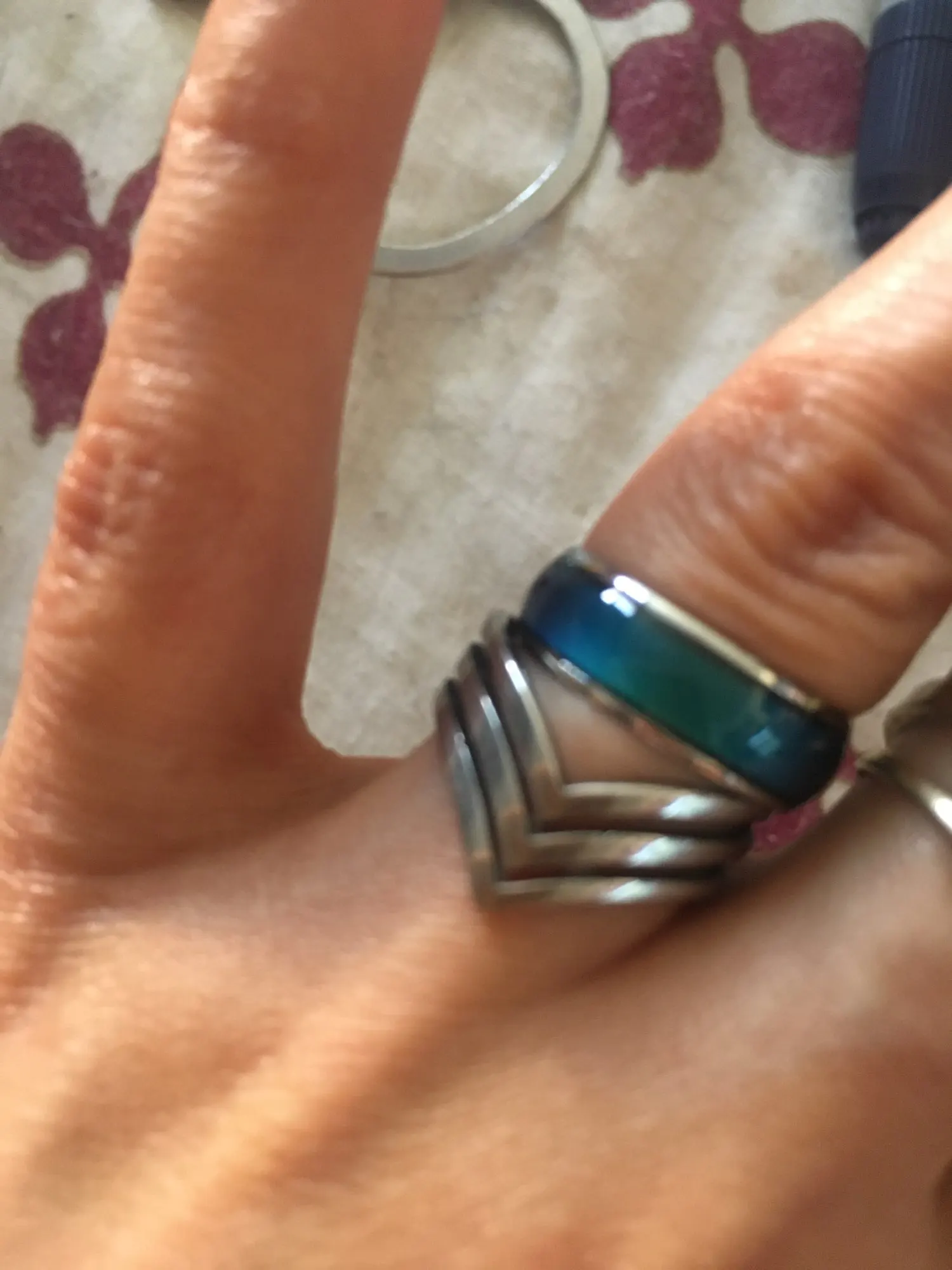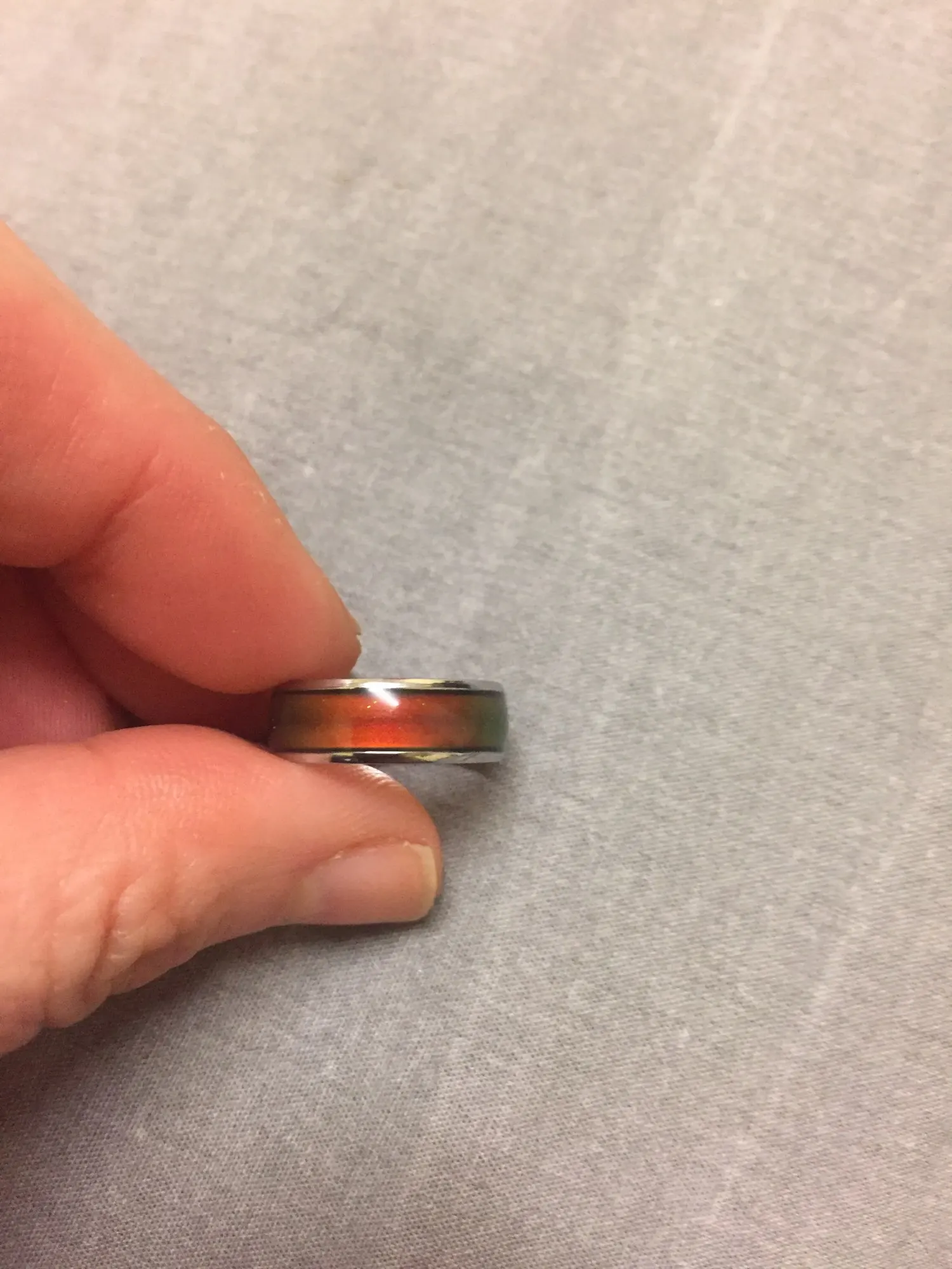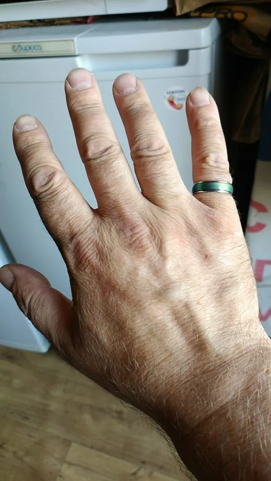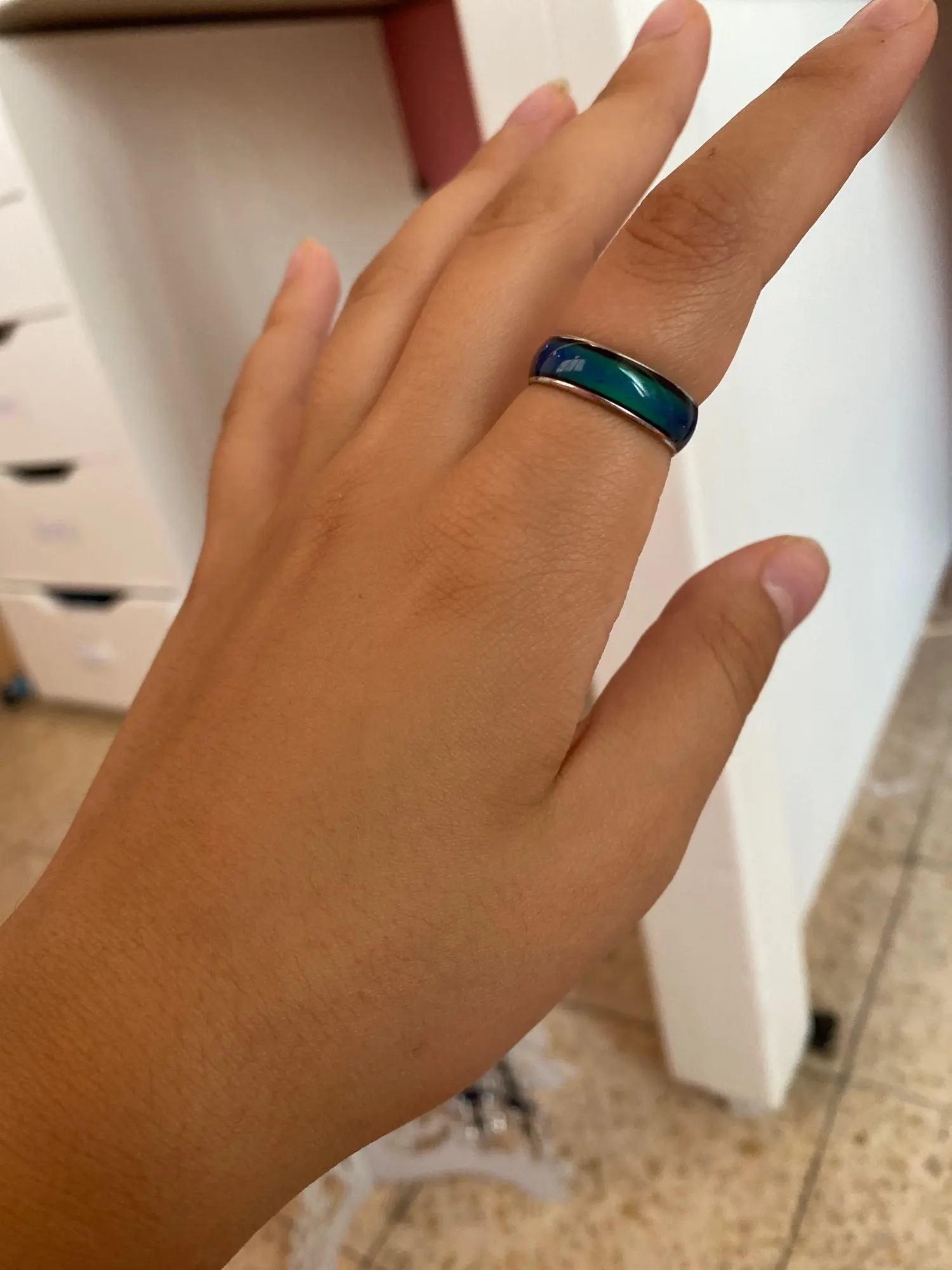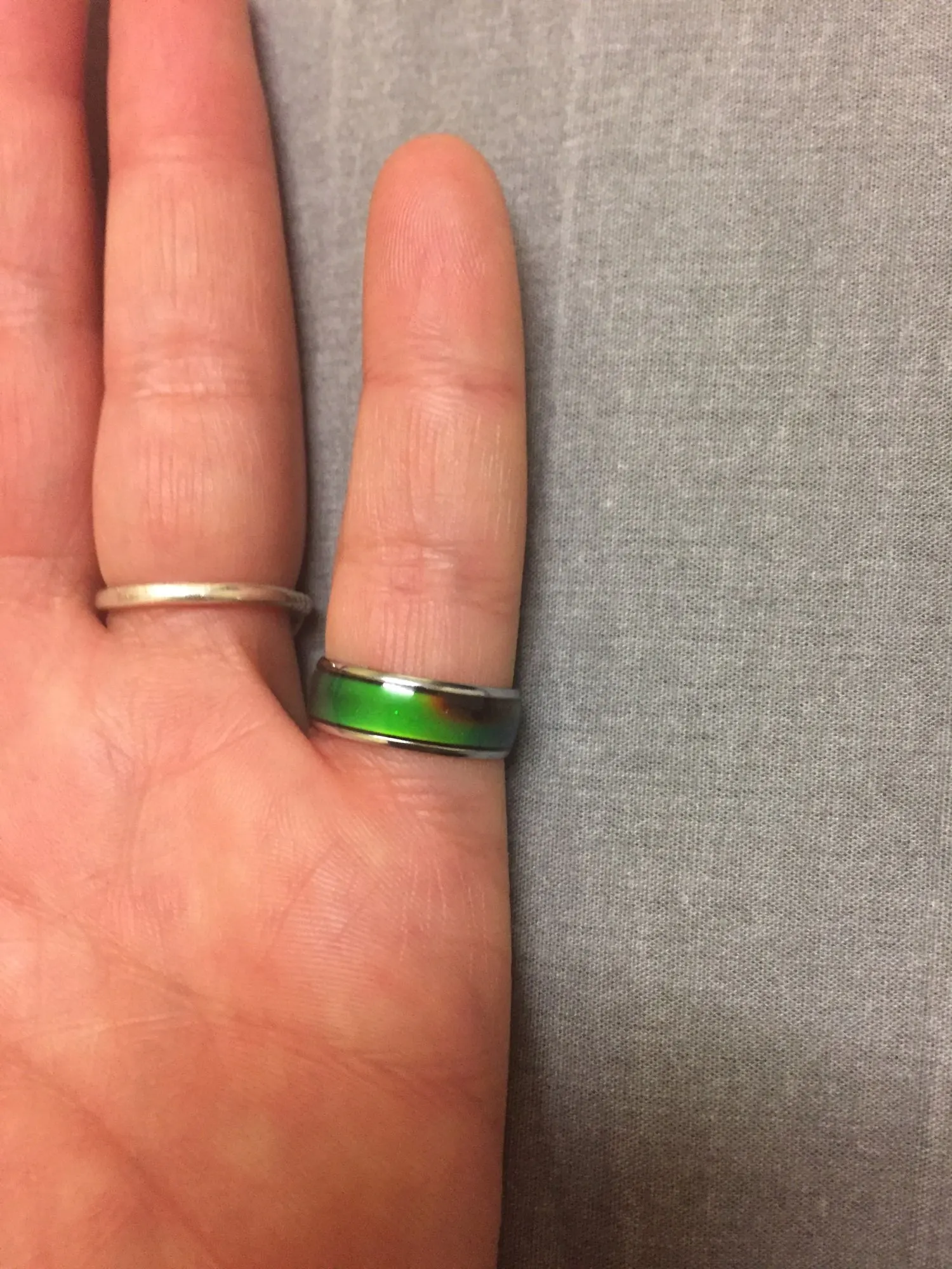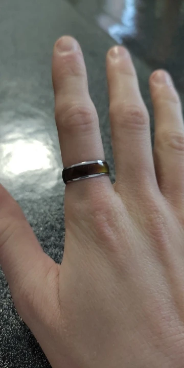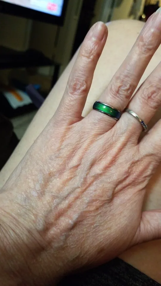 Я пробовал кольцо в течение недели, и цвета зеленые, синие и смешанные между двумя цветами. Продолжая носить кольцо, я увидел, что цвет кожи меняется на зеленый.