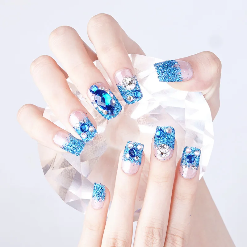 Накладные ногти с прозрачными блестками, квадратные синие наклейки на Стразы, полное покрытие, накладные ногти, 24 шт.компл., аксессуары для дизайна ногтей, ноготь невесты