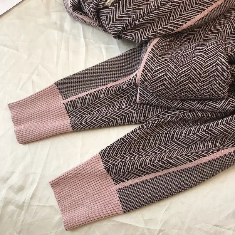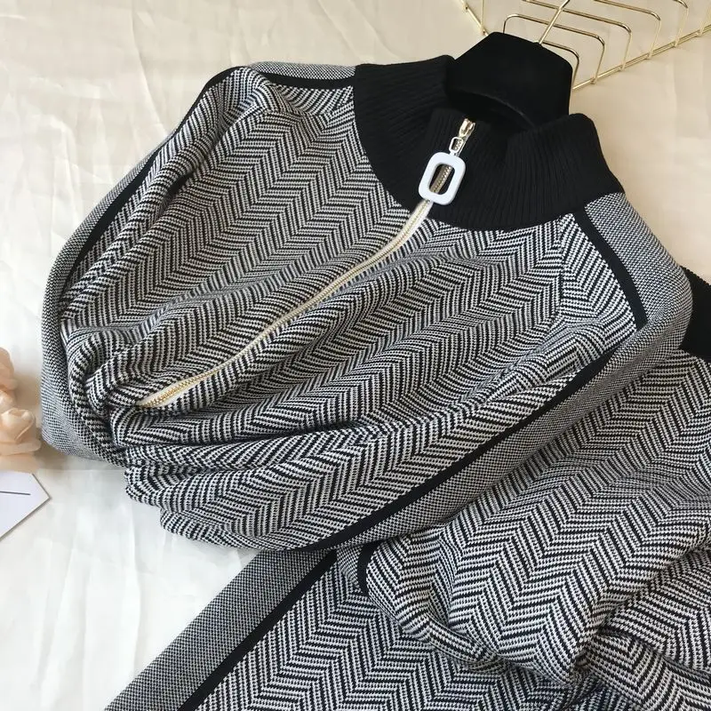 Женский спортивный костюм, зимний трикотажный кардиган на молнии с высоким воротником и штаны, комплект из двух предметов
