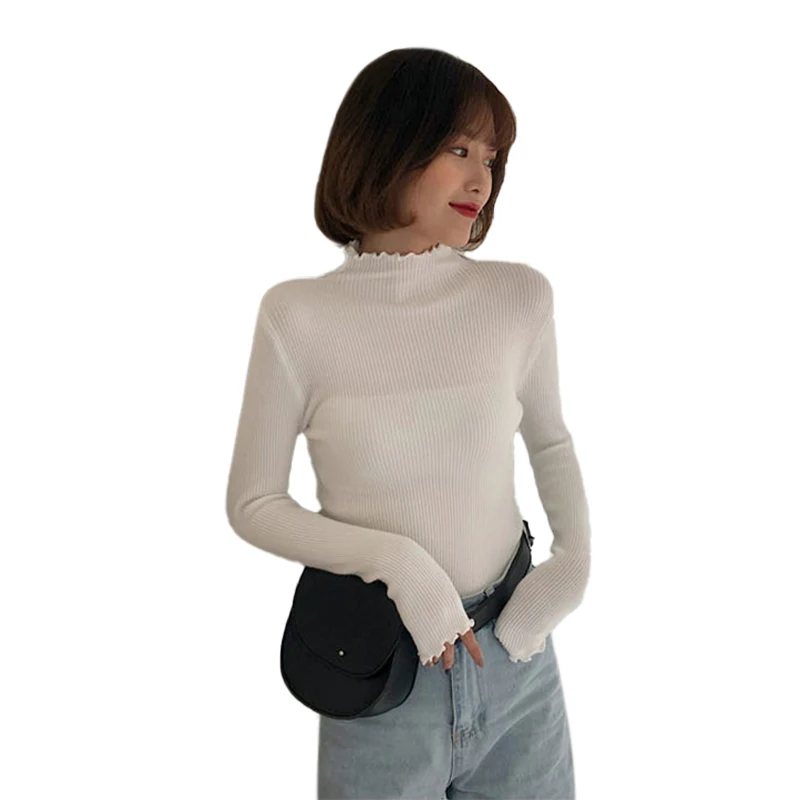 Водолазка с рюшами женский свитер высокоэластичный однотонный осенне-зимний модный свитер 2021 женские облегающие пикантные вязаные пуловеры розовый белый