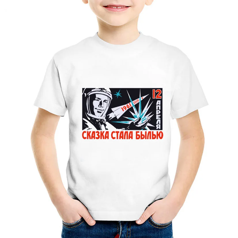 Детская футболка с мультяшным принтом для мальчиков и девочек, Советская рубашка с российским космическим дизайном, белая хлопковая Футболка с круглым вырезом для малышей