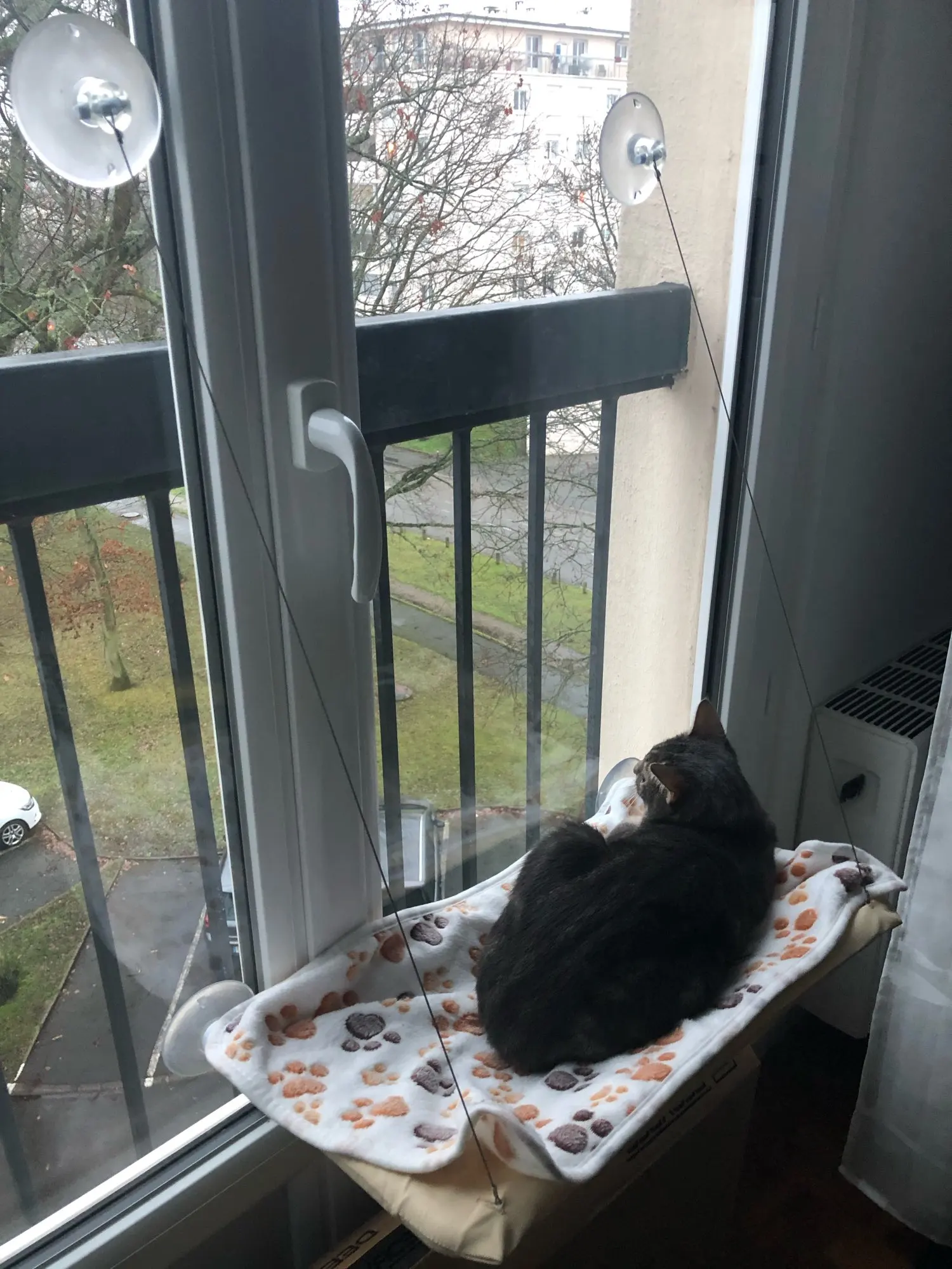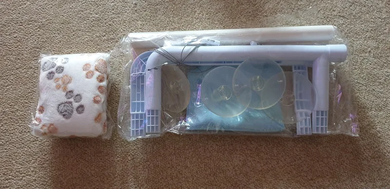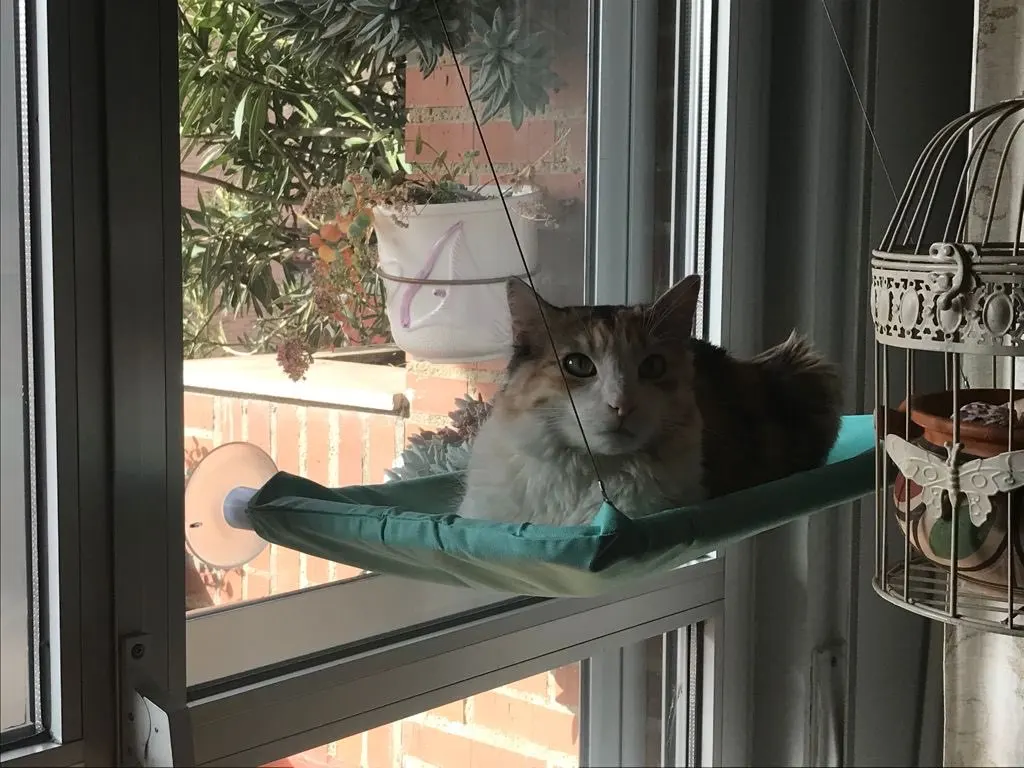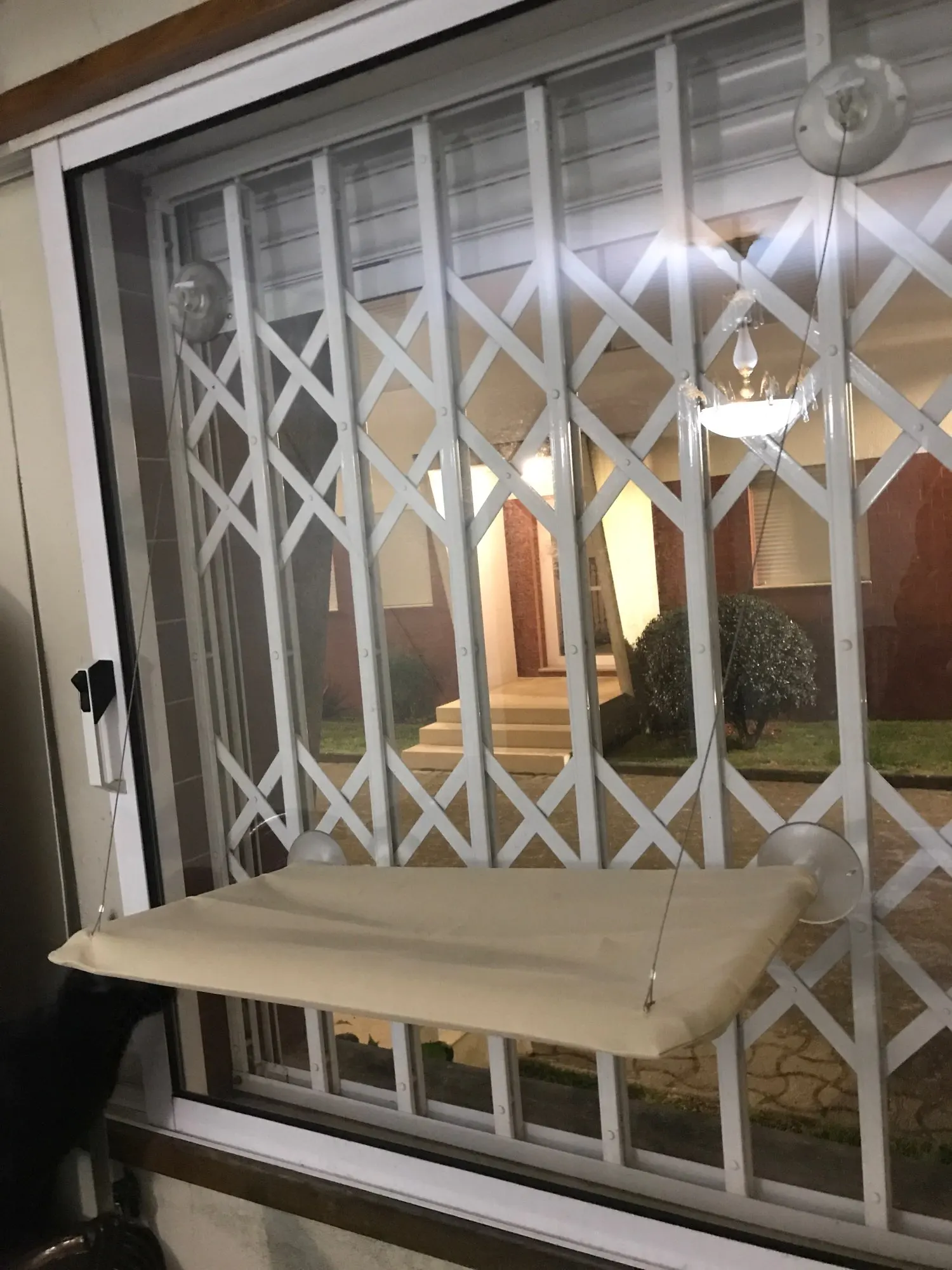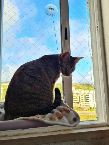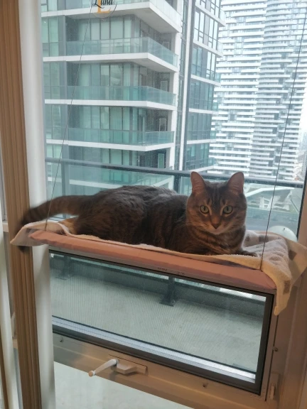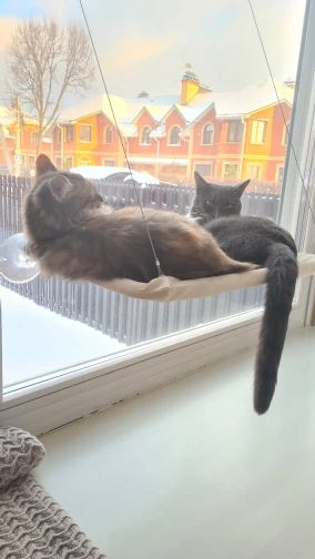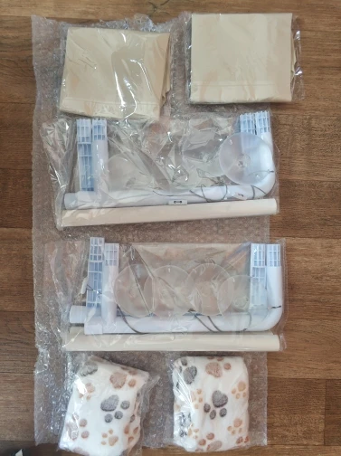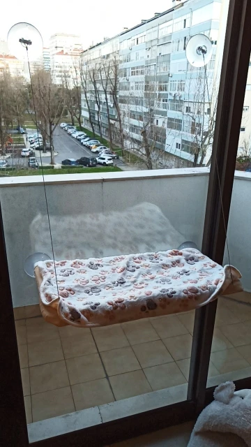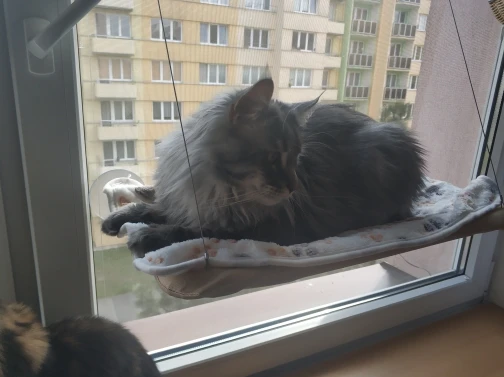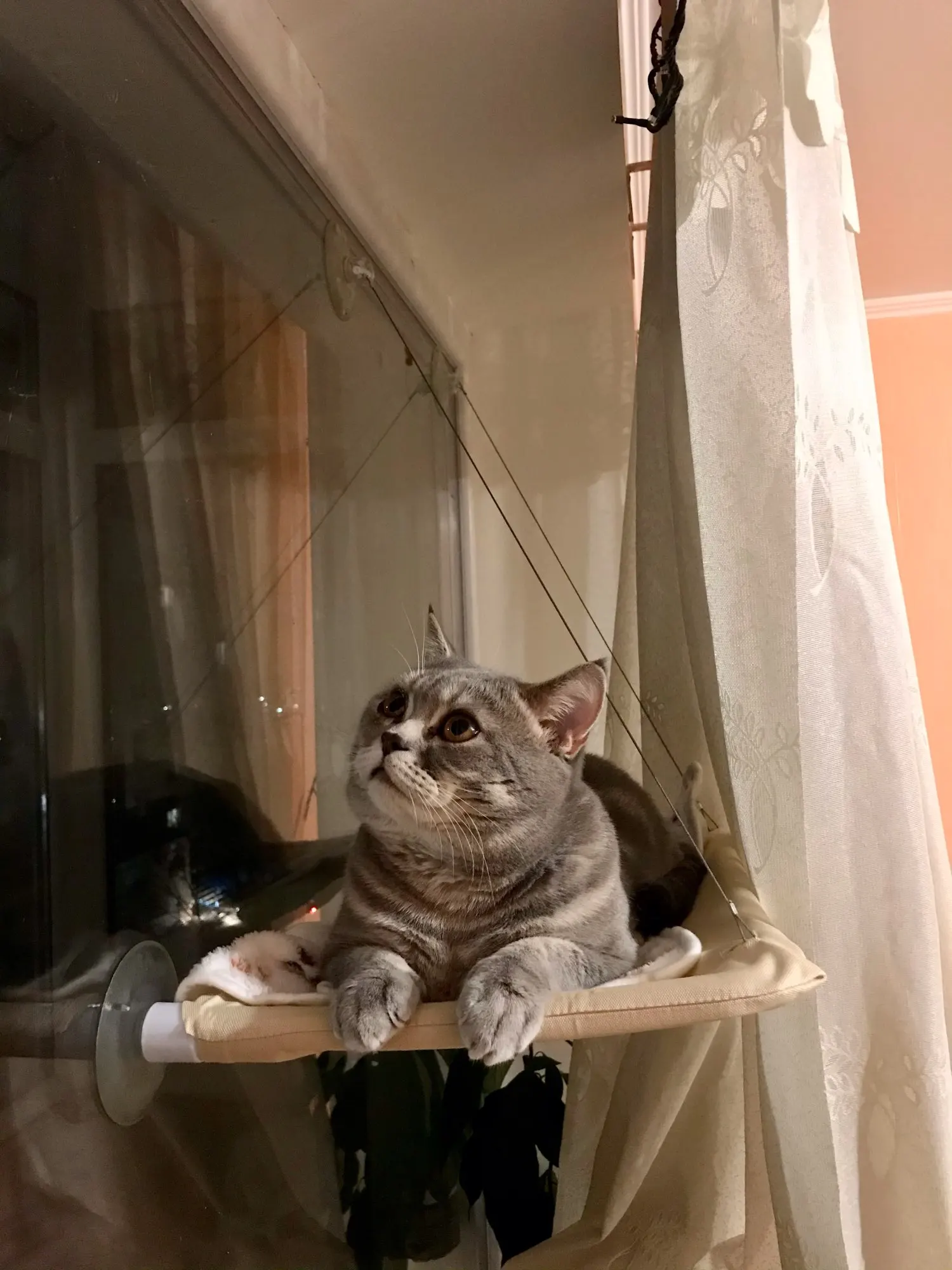 Нужно внимательно проверять размер окна. У нас окно оказалось меньше. Одна присоска на пластике, другая - на стекле. Но пока держится и так. Запах был химический, но это легко исправить. Побрызгали кошачьей мятой и кот гамак принял. Очень мило там отдыхает.