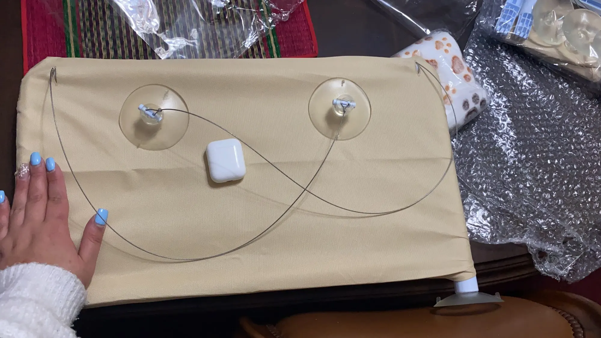 Just As described. Это пластиковый склад, который состоит из ткани. Он поставляется с 4 большими присосками и металлическими струнами. Хороший продукт.
