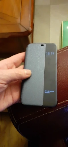 Автомат срабатывает: отвечает через обложку. При закрытии обложки картинка на экране смещается к прозрачному окну. Отверстия совпадают, сидит чехол прочно. Брали на модель Huawei p30pro