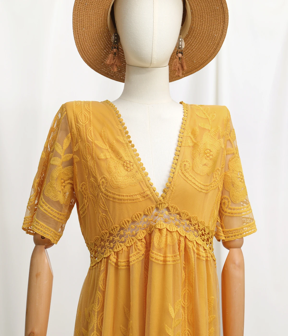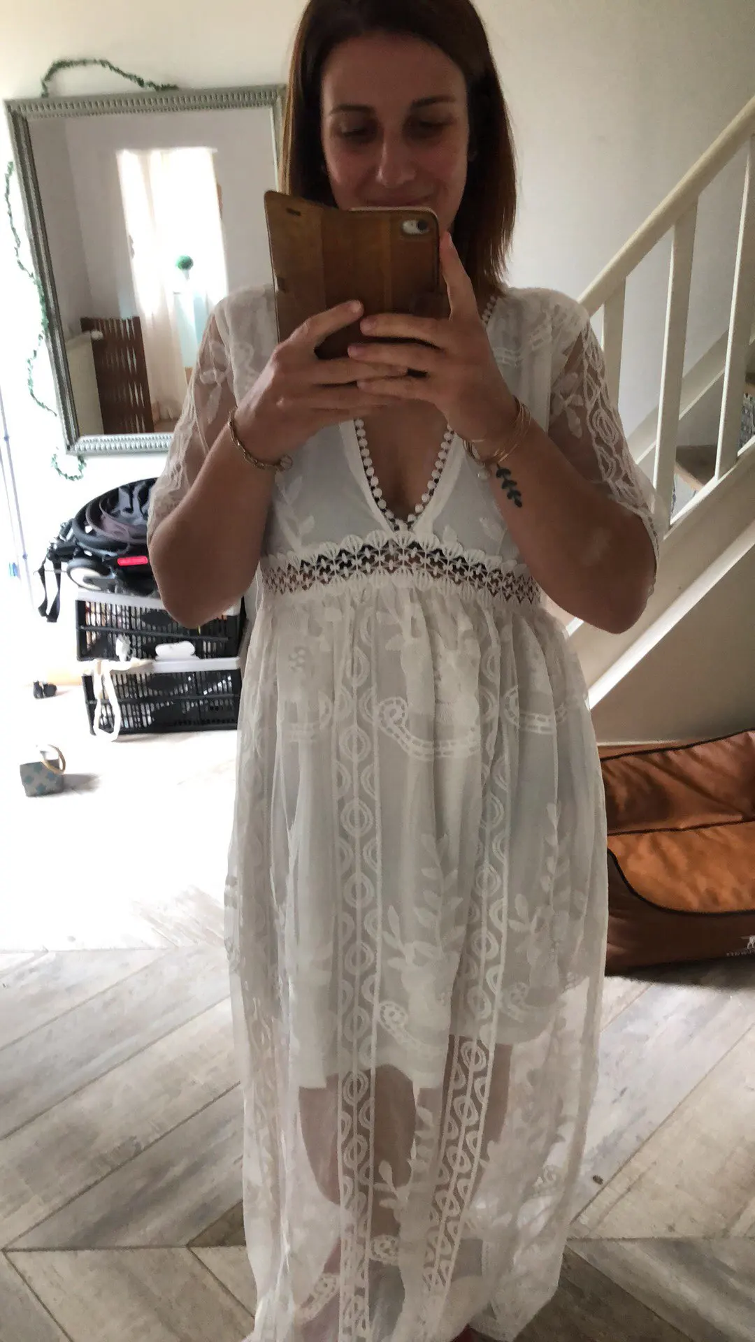 très jolie robe, la couleur est agréable malheureusement j'aurai dû prendre une taille plus grande style XL. dommage que la doublure ne soit pas plus longue après sinon la robe est belle. il faur vraiment connaître sa taille. pas facile de choisir la bonne taille