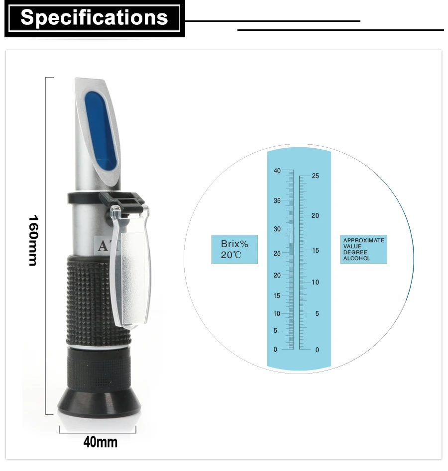 Диапазон измерения:-Brix: 0-40%-Алкоголь: 0-25%Точность:-Brix: ± 0.2%-Алкоголь: ± 0.2%Минимальное разделение:-Brix: ± 0.2%-Алкоголь: ± 0.2%Диапазон ATC: 50 - 86 °F / 10 ~ 30 °CРазмеры: 6,30x1,57x1,57 дюймов/160x40x40 ммВес: 250 г