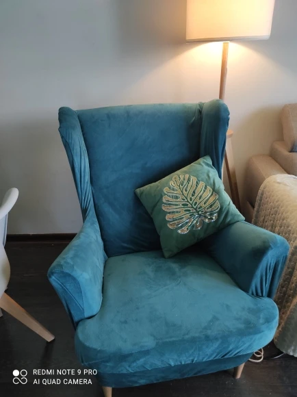Bardzo fajny welurowy materiał. Staranne wykonanie. Na fotel STRANDMON pasuje, ale nie jest idealnie. Ja jednak jestem mega zadowolona. Kolor jak na zdjęciu. Na moim nieco inny, chyba światło tak zadziałało. Polecam z czystym sumieniem. Wszystko oki i szybka wysyłka. Bardzo dziękuję