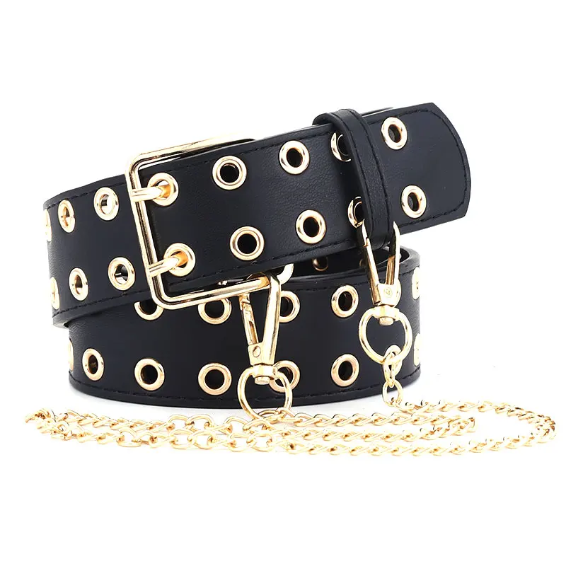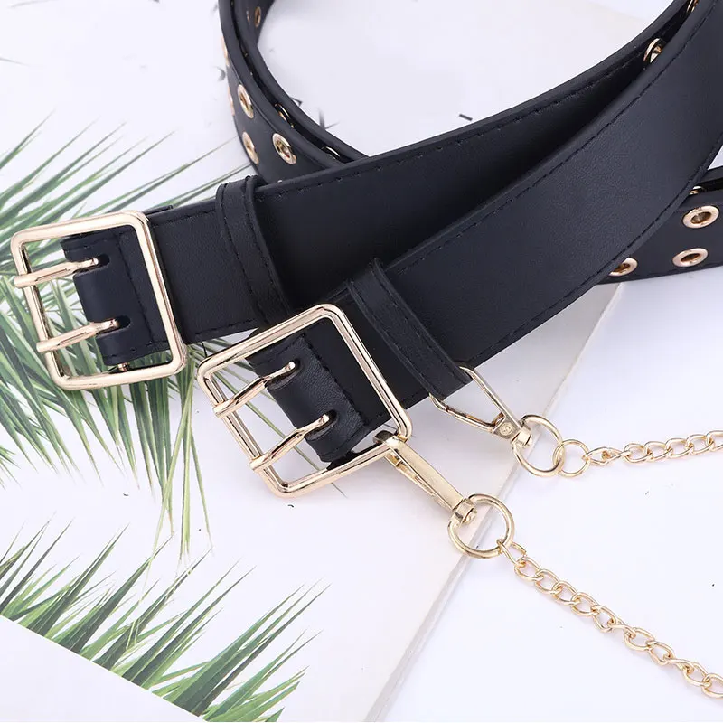 Модный дизайнерский женский ремень в стиле панк, черный, белый, розовый, красный, коричневый кожаный ремень с двумя люверсами и ремнями-цепочками для женщин, брюки, 2020