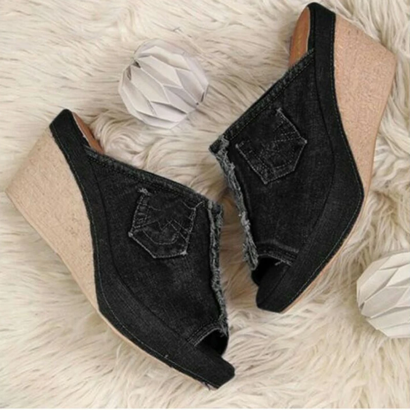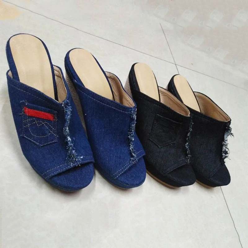 Sooneeya/повседневные Модные женские босоножки; Женская обувь на танкетке; Женские шлепанцы на высоком каблуке с открытым носком; Джинсовые Вьетнамки; Цвет черный, синий; 43