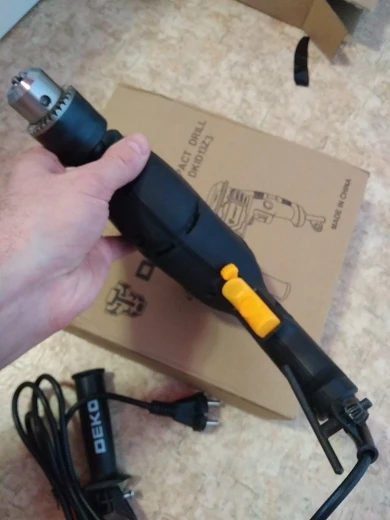 доставка 7 дней из России, на почту. Что могу сказать дрель не плоха за свои 1300, есть регулятор оборотов, реверс, функция сверления и долбления, сделана дрель аккуратно, курок имеет приятный ход. Есть косяк, один лепесток из трёх на патроне короткий, но на работу не влияет. Биение патрона нет. Сверлильные бетонную стену в панельном доме, сверлом на 6 мм, просверлил на ура. Дрель имеет честный патрон на 13 мм. Но сам металл патрона не очень, после смены раз пять сверл, на ключе и патроне имееются следы износа, что странно, хотя в эти деньги лучшего ещё поискать. Рекомендую